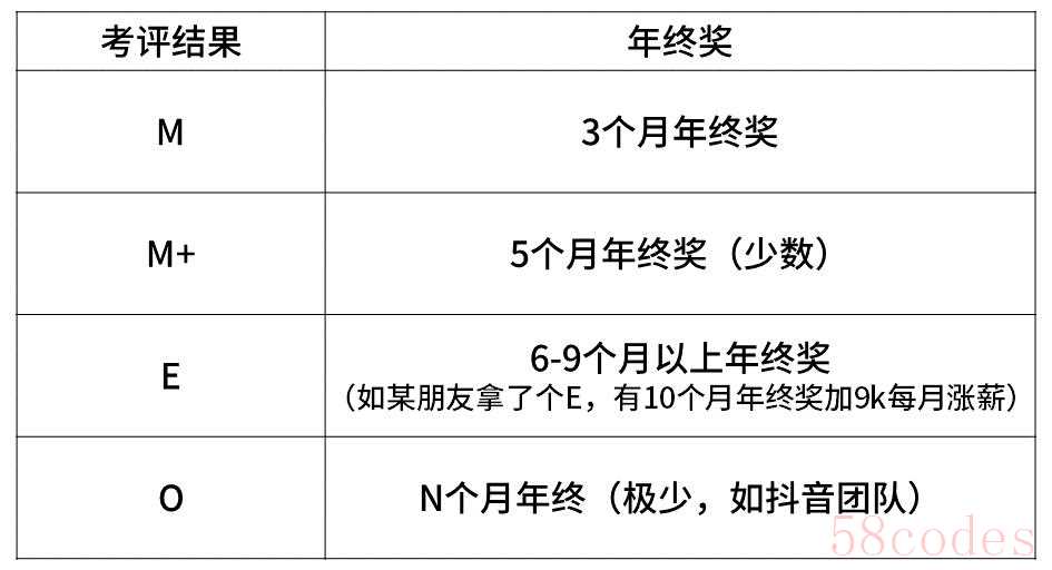 年终奖一般0-6个月,会在每年3月发放,例如 9月入职会发 18.9-19.3 这段的年终奖。一般中等大多数是15薪,如果年中绩效超预期多2个月年中奖,年末再超出预期差不多至少7-8个月,比例较少,对应结果分别为: