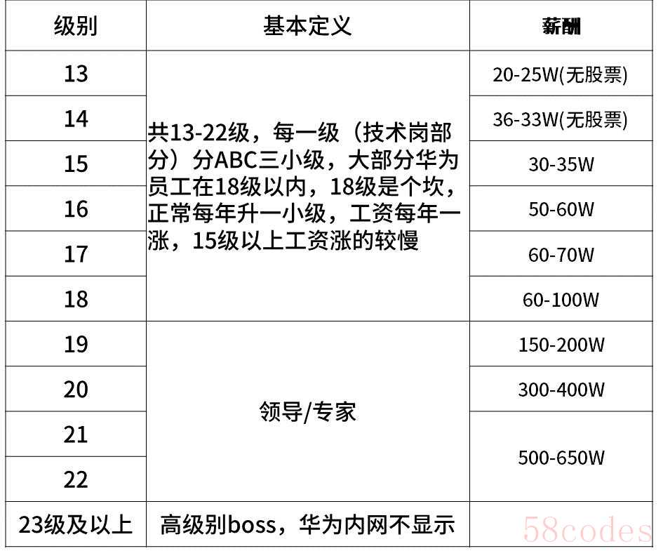 18级是重要分水岭,往上升需要重新考评、答辩,越过去后就是领导/专家。正常来讲,华为员工每年可以升一小级,工资每年一涨,不过15级以上工资涨得较慢。当然,业绩特别突出的员工,也可以一年涨一大级甚至连跳二三级。19级以上属于领导岗和专家岗,公司内网可查到员工22级以内,23级以上的则属于非常高级别的boss。