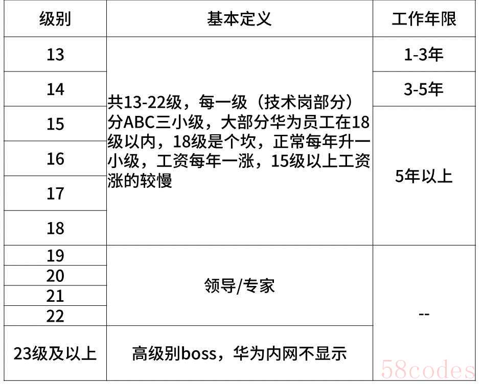 华为员工级别分为13-22级,23级及以上为高级别boss,华为内网并不显示他们的级别。每一级分A/B/C三小级(技术岗不分小级)。