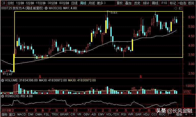可以看到,京东方A在已经在目前的支撑和阻力区间内盘整了较长时间了,目前接近盘整区间的上边界,同时上涨放量,下跌缩量,量价配合。