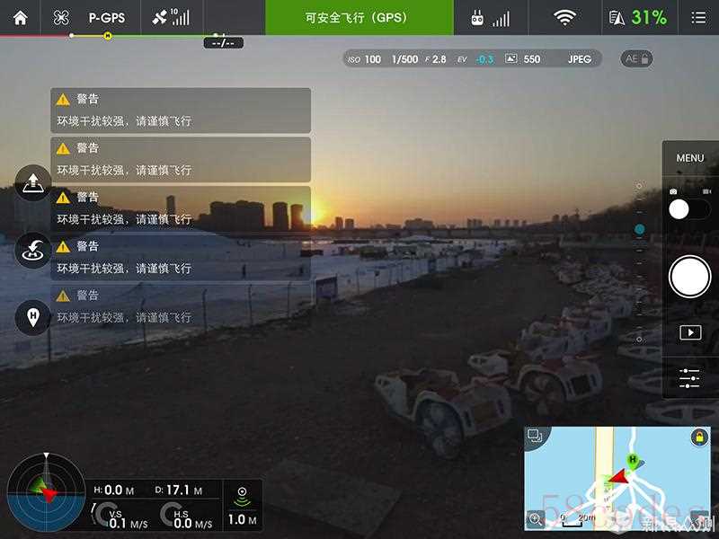 在整个飞行体验当中,有一点不爽的地方是由于所在位置的场景(处于水上公园下面有很多铁部件的因素吧),客户端一致警告“环境干扰较强,请谨慎飞行”。满屏提示的话,大家看到屏幕的左边已经被这个警告霸屏了,这样很影响观看体验,而且对操作有一定的影响。在这里,笔者建议该警告如果一致存在就设置为一条常驻即可,如果警告解除则关闭提示。这样能更提高观看屏幕时的体验和操作安全。
