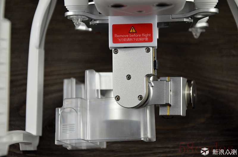 没错,就是这个红色的垫块啦,“Remove before flight”,飞行前一定要取下来,这个红色的垫块只是为了运输途中防止云台的损坏,在到手之后可以直接扔掉。千万不可带着它去飞行,否则云台不但起不到应有的稳定效果,而且还会影响云台的转动造成电机损坏。