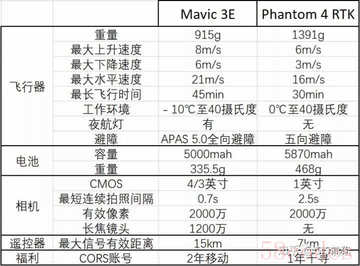 我们选取了大家较为关心的几项参数,将Mavic 3E与Phantom 4 RTK进行对比:
