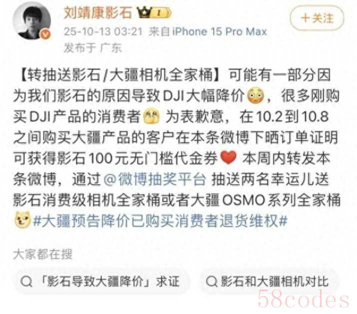 消费者没等来大疆的补偿,却收到了来自隔壁友商老板的道歉:10月13日,影石创新CEO刘靖康向消费者致歉,并发放100元无门槛代金券。