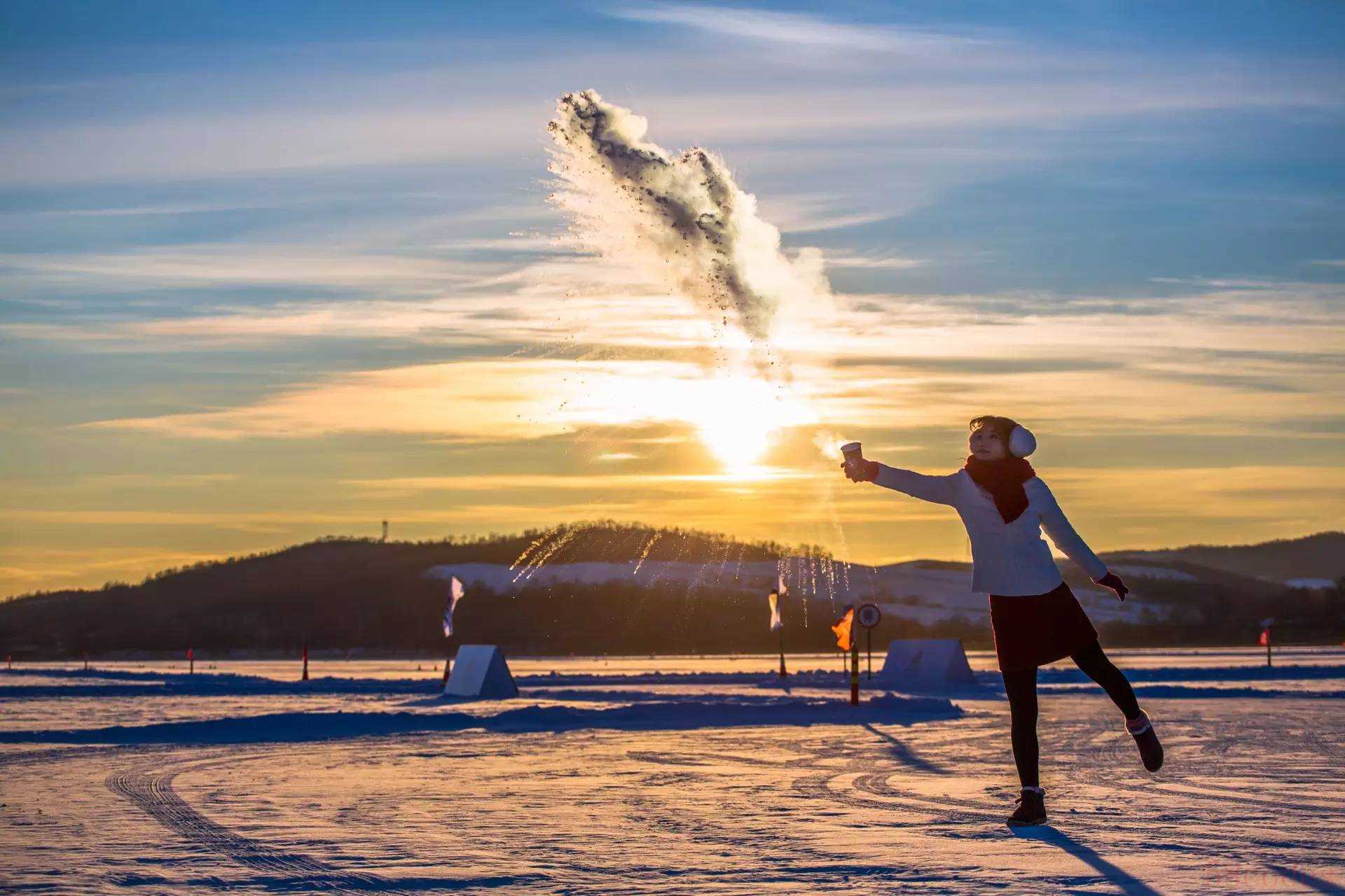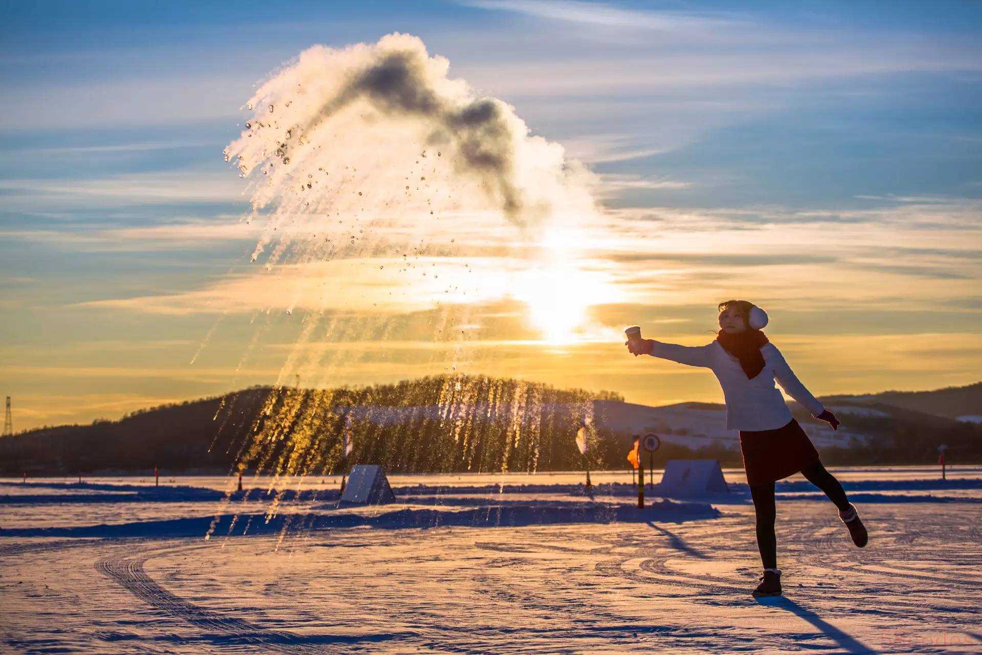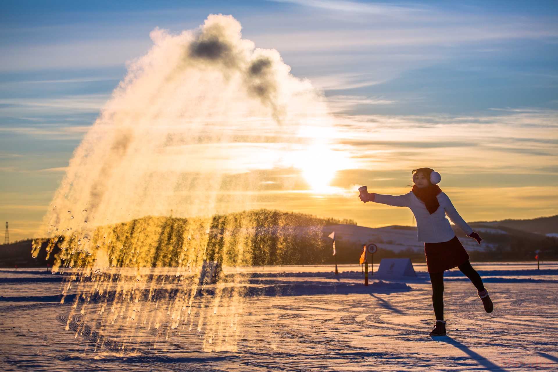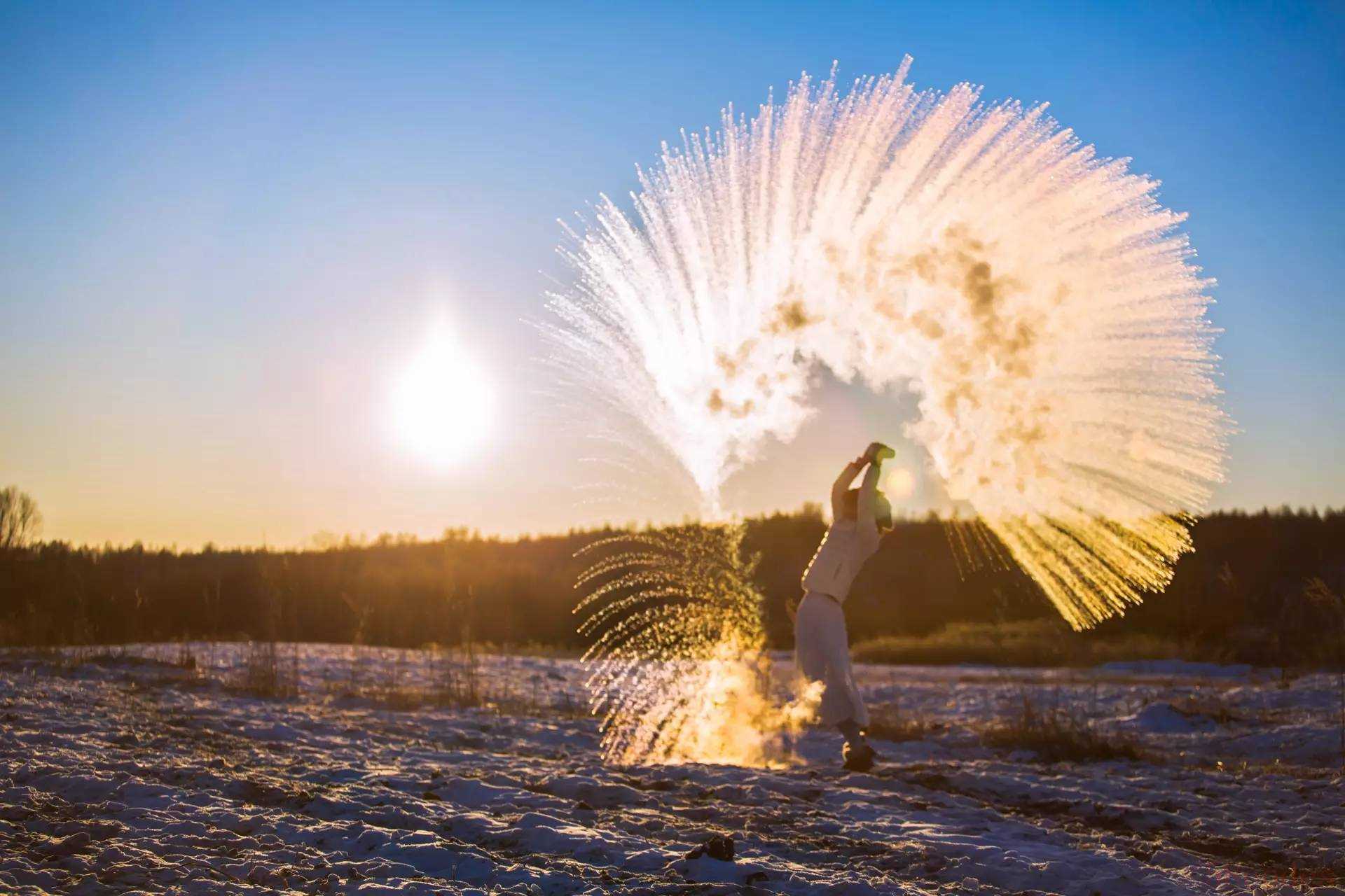 热水被用力地抛向空中,一瞬间,形成干冰一般的烟雾,周围洒出来的水珠瞬间凝结,不过一秒钟,迅速变成冰珠,颗颗掉落在雪地里。