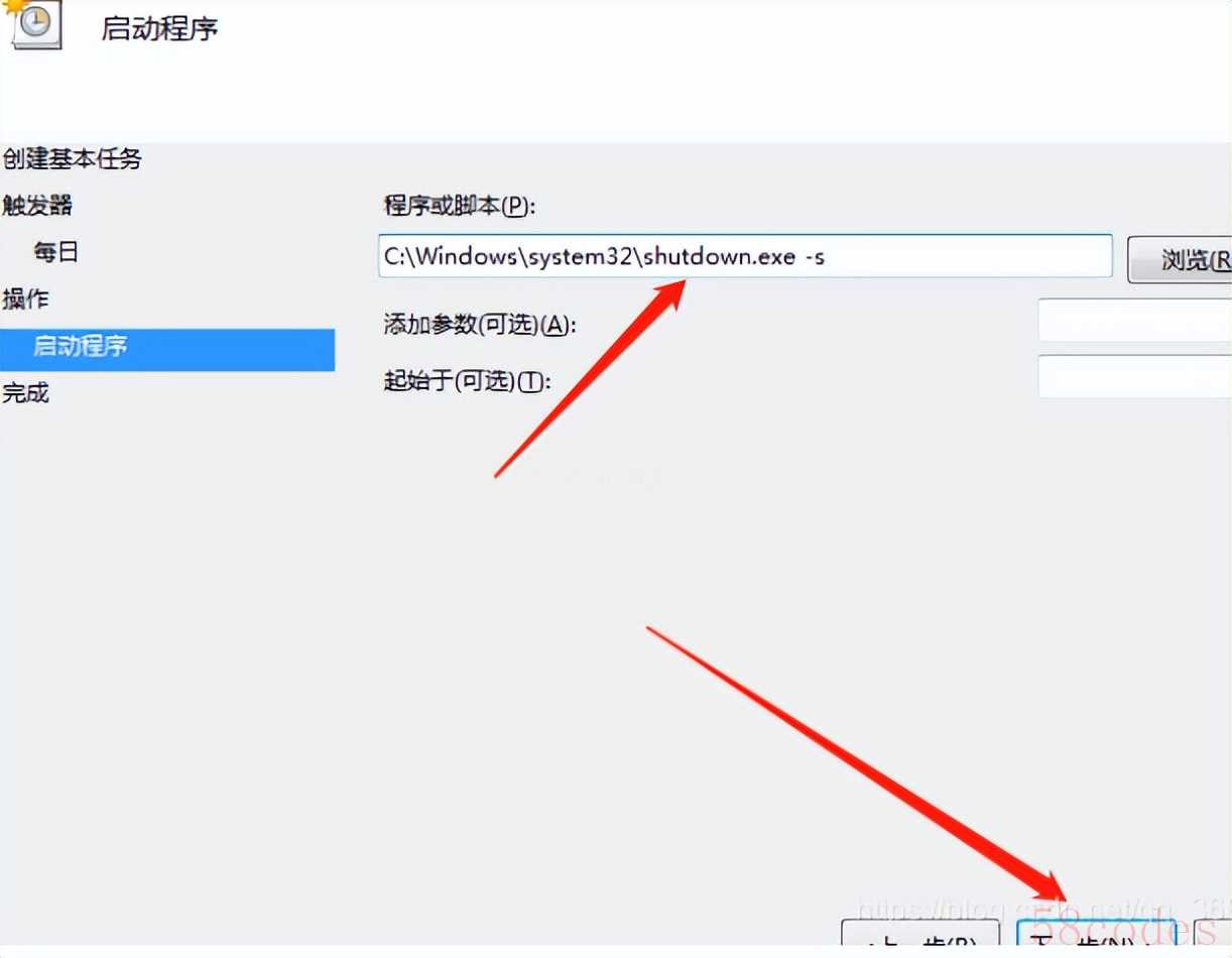 接着选“每日”,设置执行时间。再点“启动程序”,在输入框里打上“shutdown /s /t 0”(注意空格别漏)。