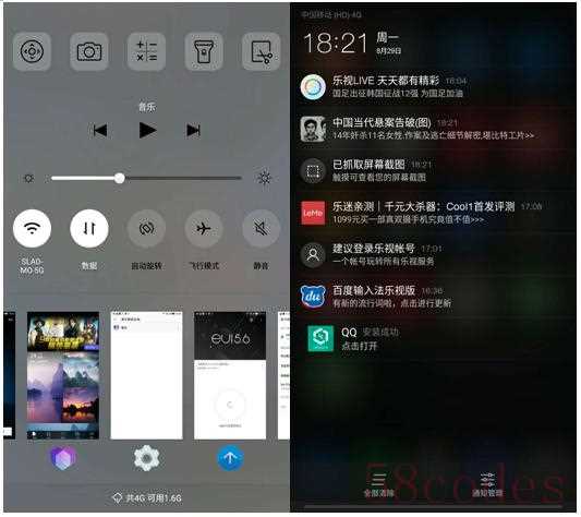 EUI5.6的多个功能任务栏一直是个标志性的东西,其集成了常用工具(包括红外遥控器、相机、计算器、手电筒以及屏幕截图)、音乐操作栏、亮度调节、快捷开关键以及多任务管理,这样的设计使得通知栏更加的纯粹,不会显得杂乱、无序。想要一键关闭所有打开的程序也是非常简单,点击多任务栏最低下的内存显示条就能直接关闭所有打开过的程序了。