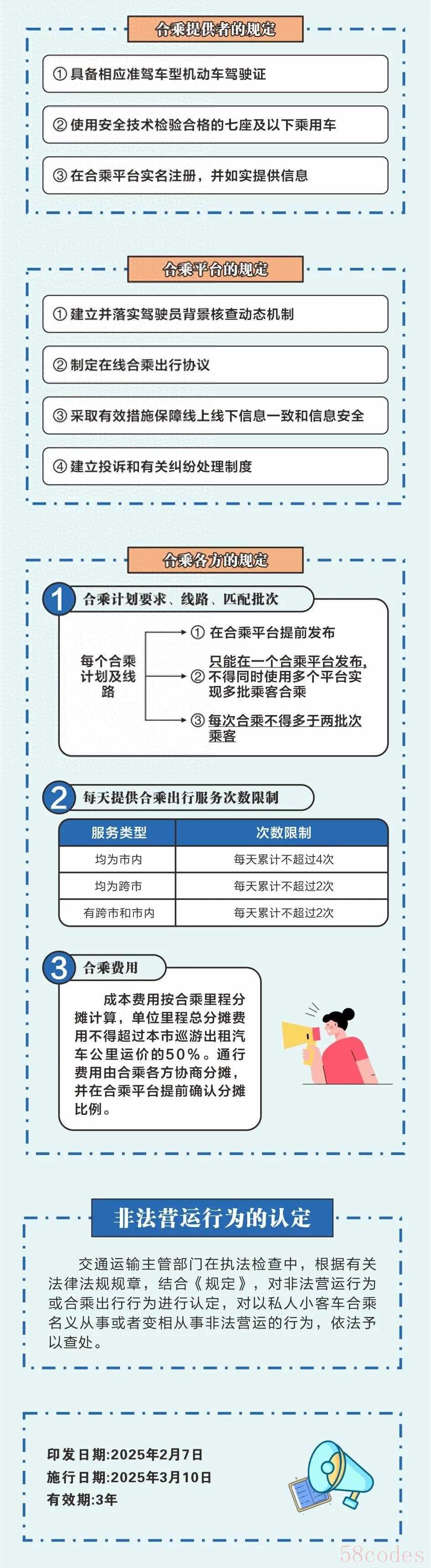 规定明确了“拼车”“顺风车”的合乘服务性质、平台责任及费用分摊标准,并划定与非法营运的界限。
