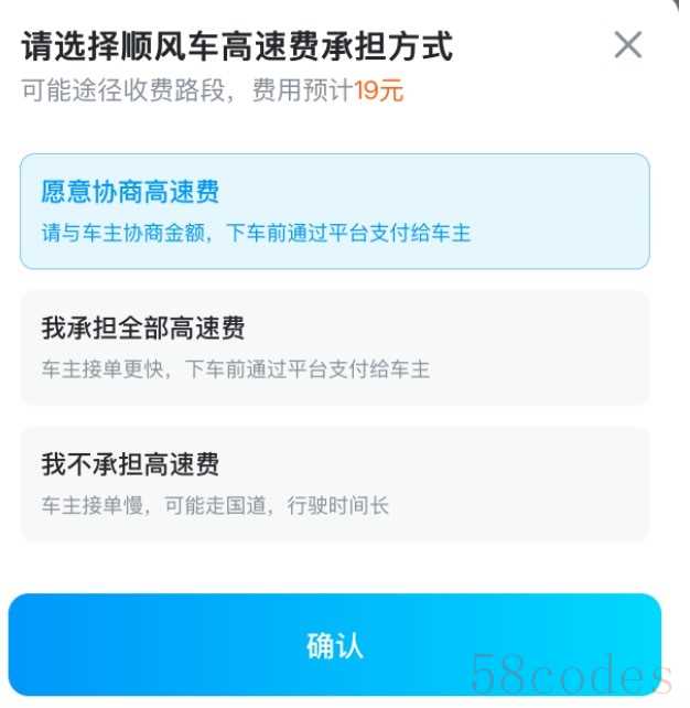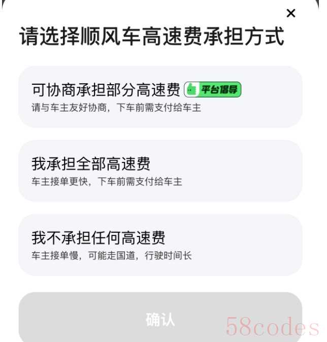 顺风车平台在订单选择页面有明晰的“高速费用承担方式”的多个选项。