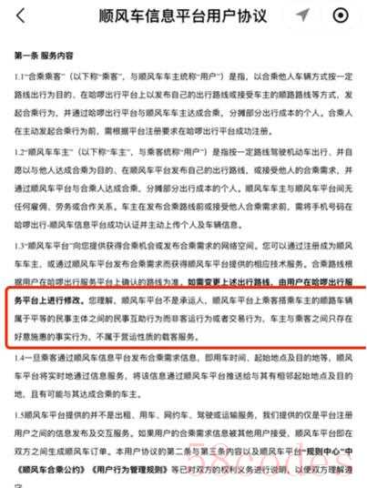 记者发现,多个顺风车平台规则信息显示,“顺风车平台上乘客搭乘车主的顺路车辆属于平等的民事主体之间的民事互助行为而非客运行为或者交易行为,车主与乘客之间只存在好意施惠的事实行为,不属于营运性质的载客服务。”
