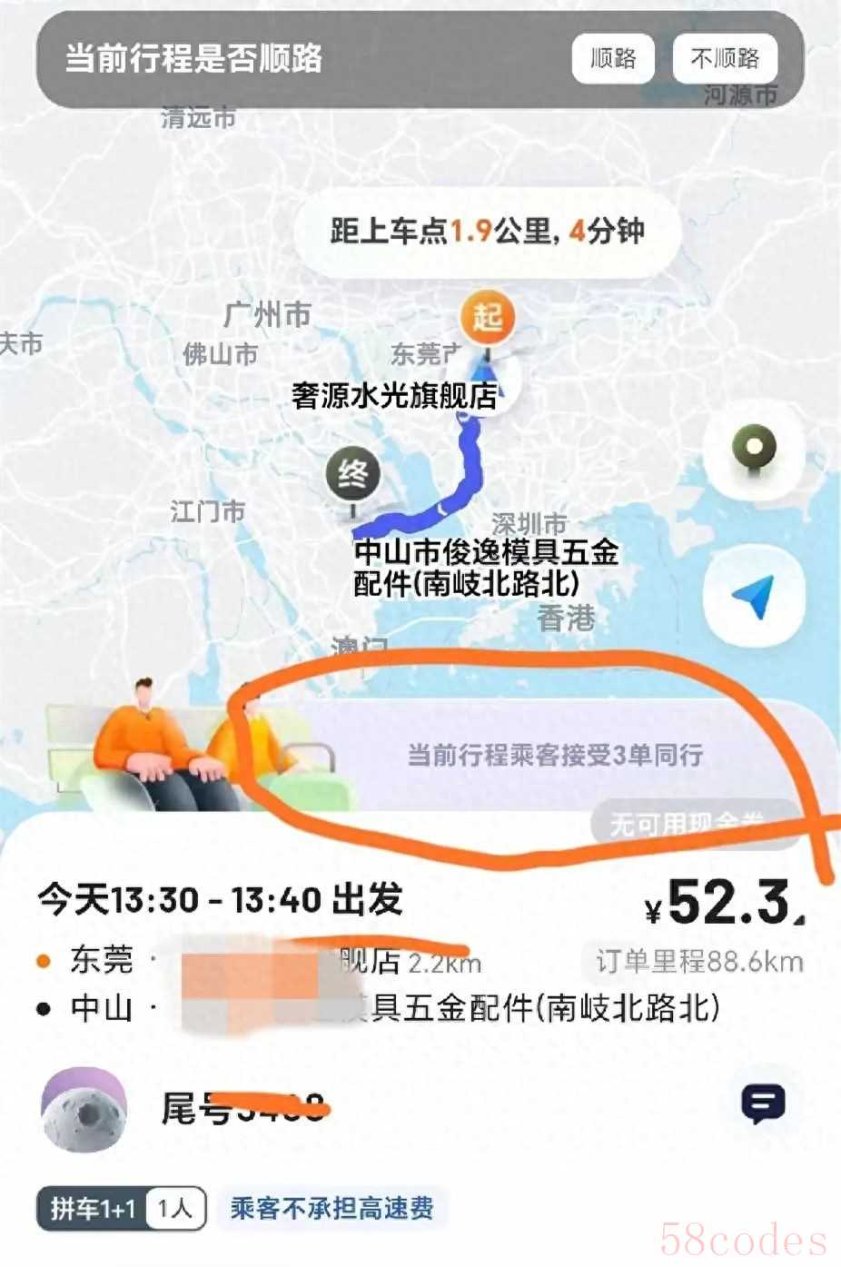 一笔从广东东莞到中山市的跨市顺风车订单,全程88.6公里,司机车费仅为52.3元,平均算下来,还不到6毛钱一公里。