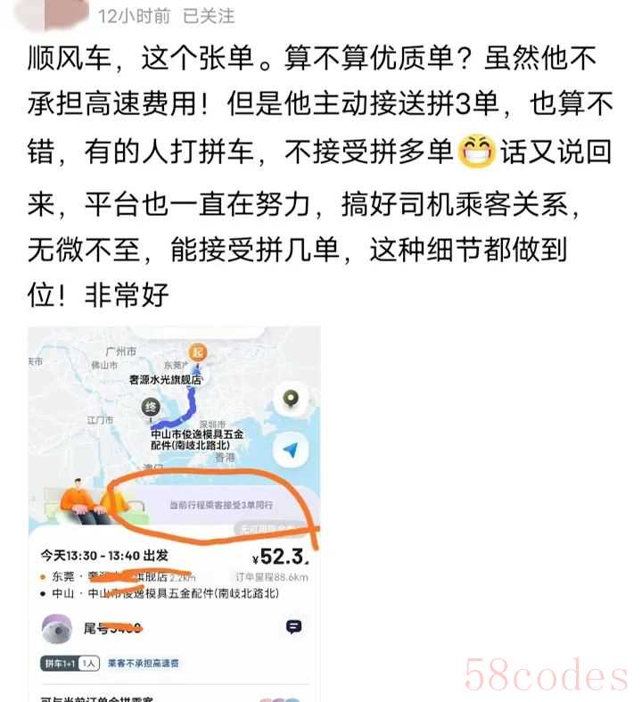 因为订单单价虽然低得有点可以,但是,乘客不仅不介意接单司机同程拼客,甚至专门做出这个说明,来表达自己的态度,仅凭这一点,对很多的顺风车司机来说,都可以把它视之为某种程度的“优质单”。