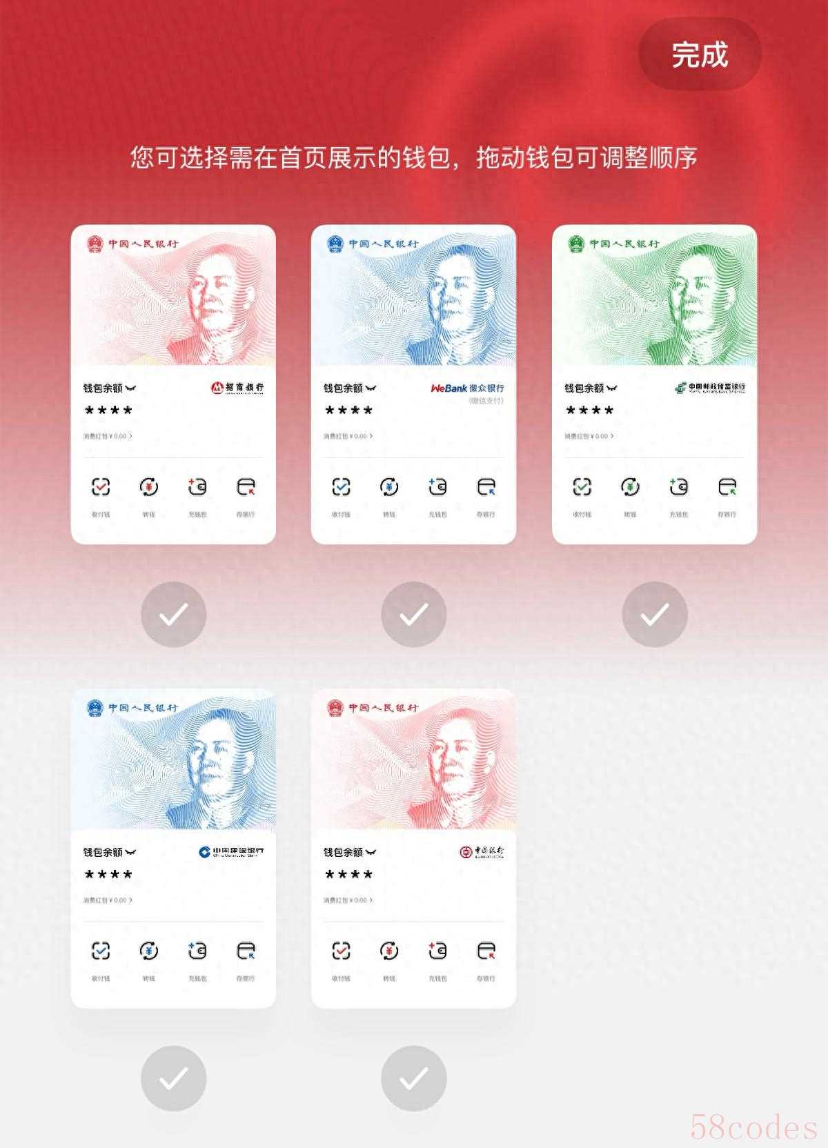 具体来看,版本更新后,用户首次进入数字人民币App首页便会进行文字提示,引导用户点击进入钱包设置入口。进入对应页面后,用户可根据实际使用需求,勾选想在首页进行展示的钱包,并且拖动钱包即可调整顺序。