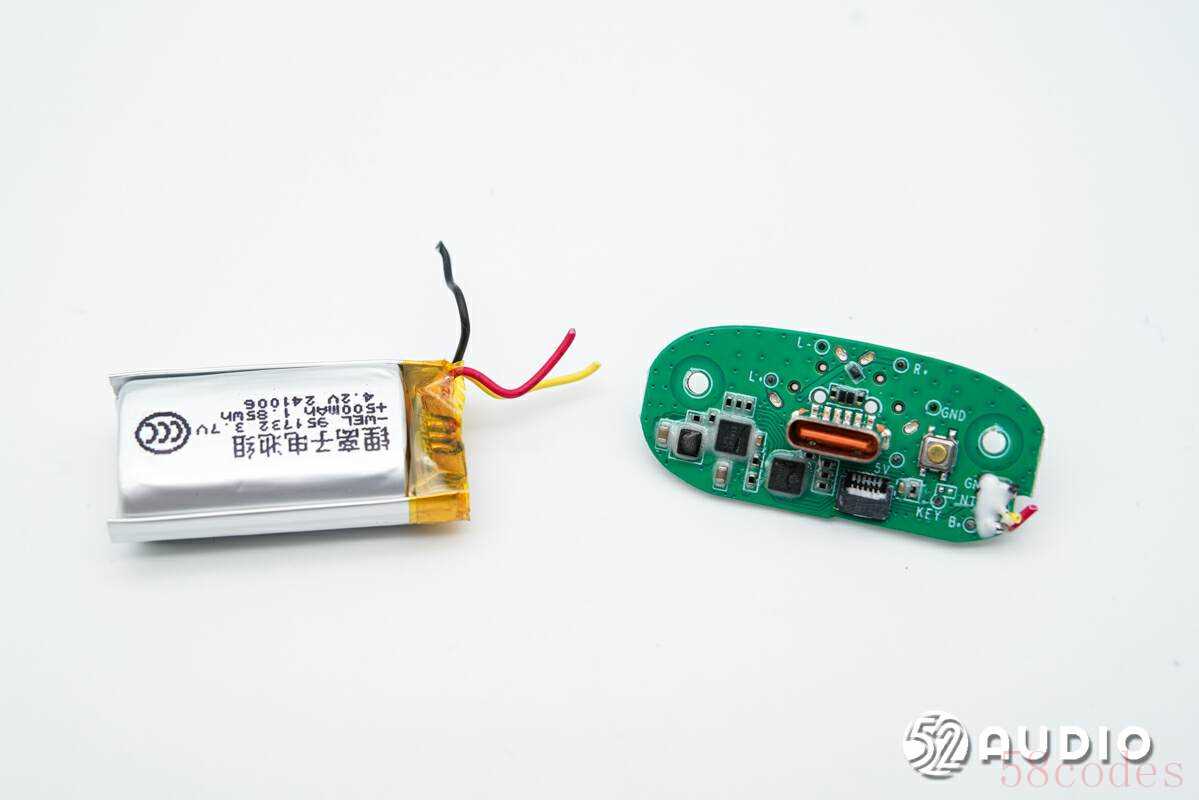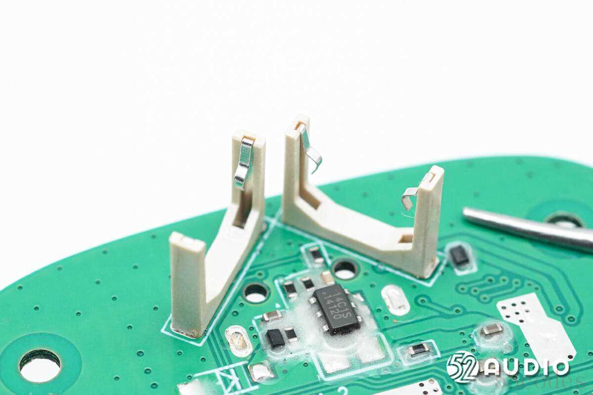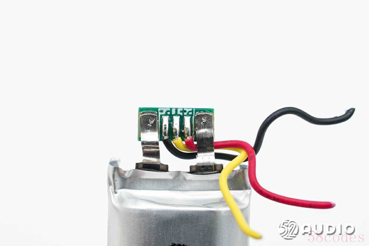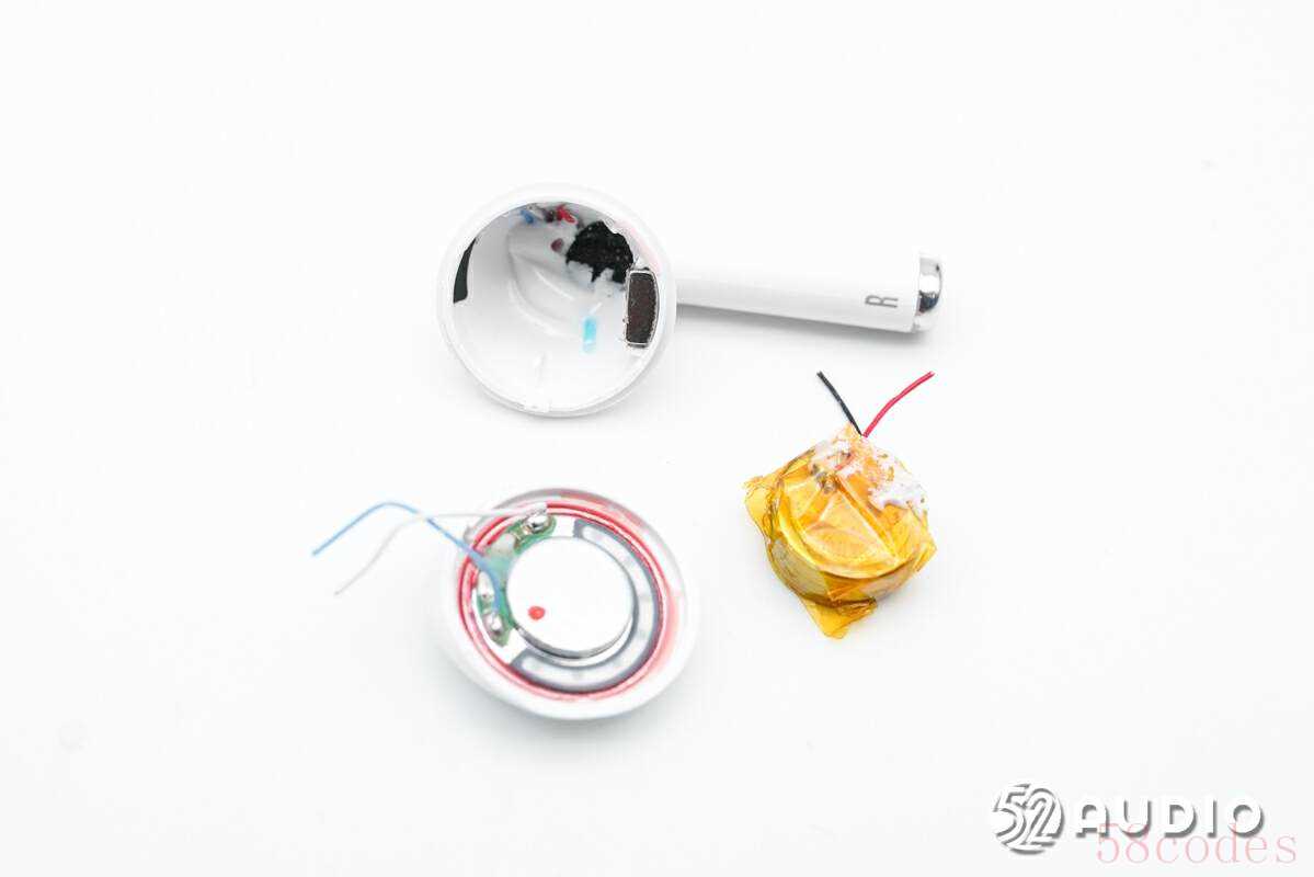 取出电池,后腔底部结构一览,扬声器和电池导线过孔连接到耳机柄内部主板,打胶密封。