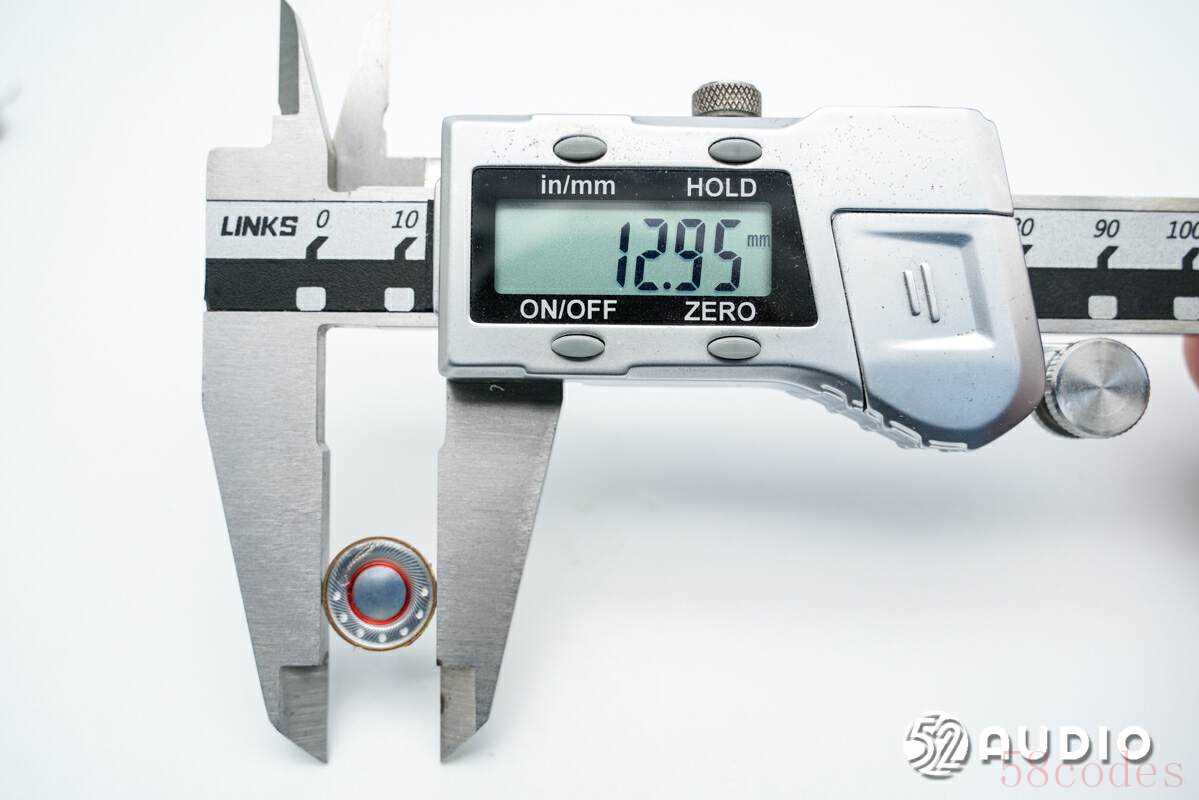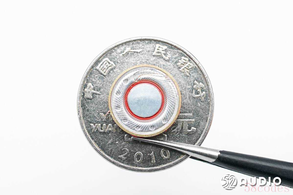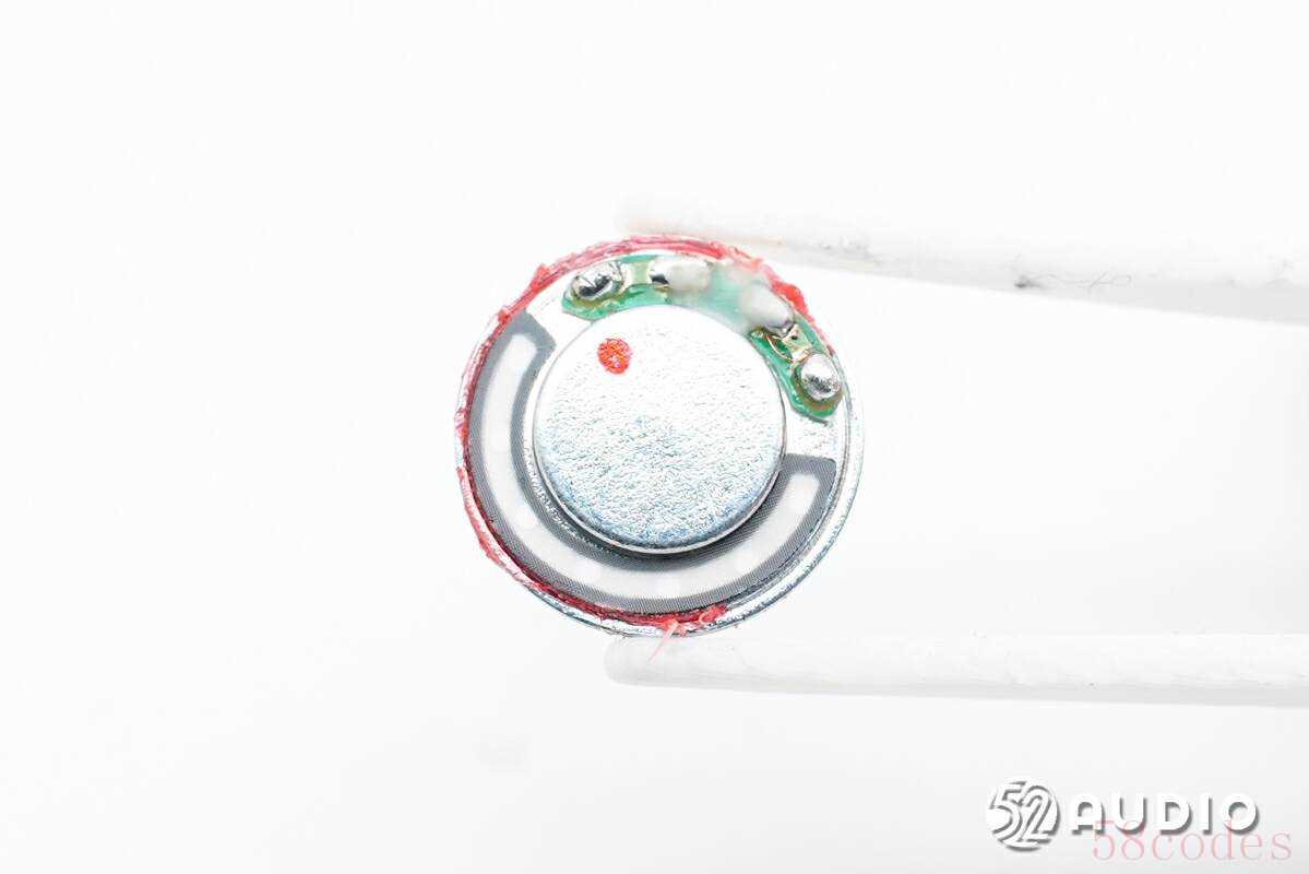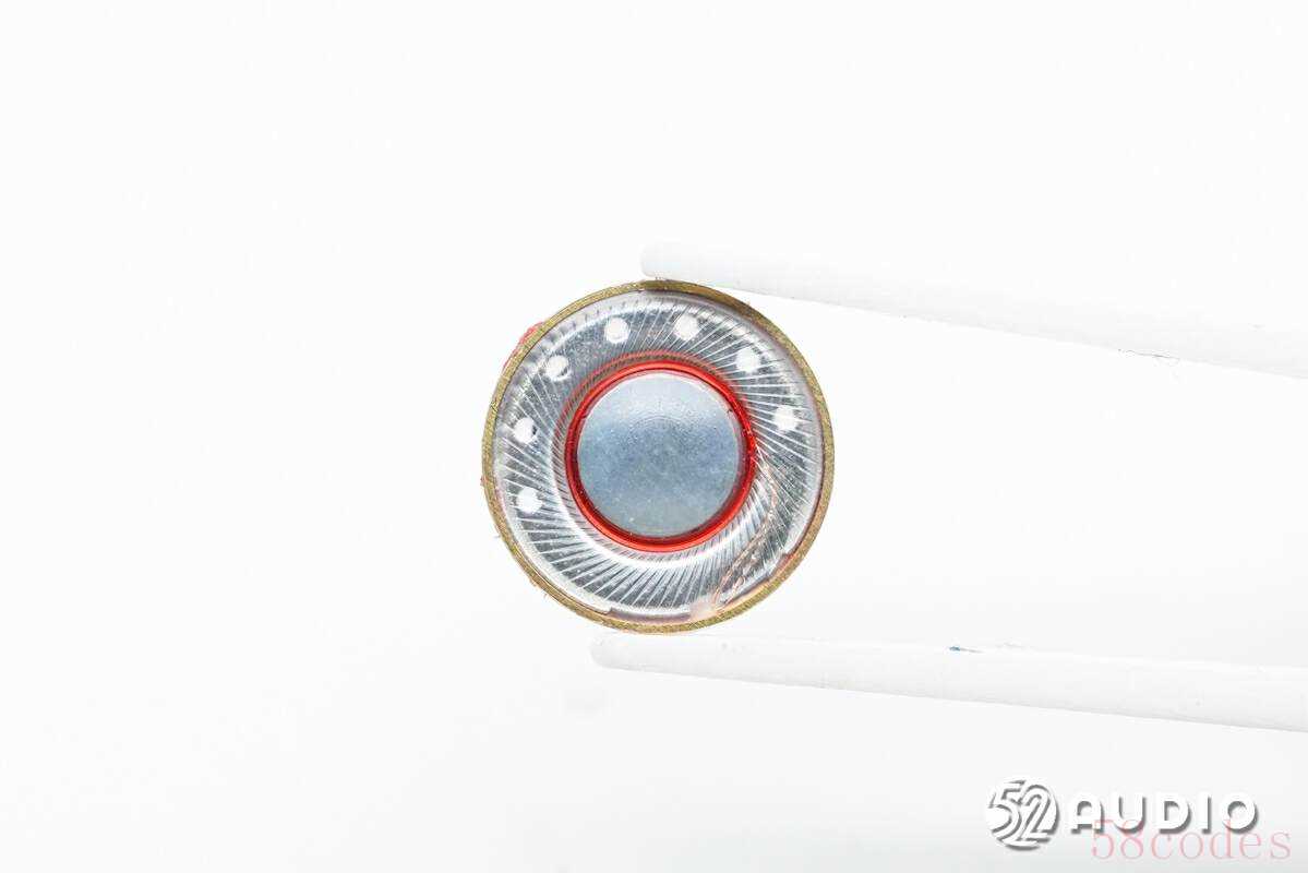 耳机扬声器背面特写,边缘设置调音孔,通过丝网防护。