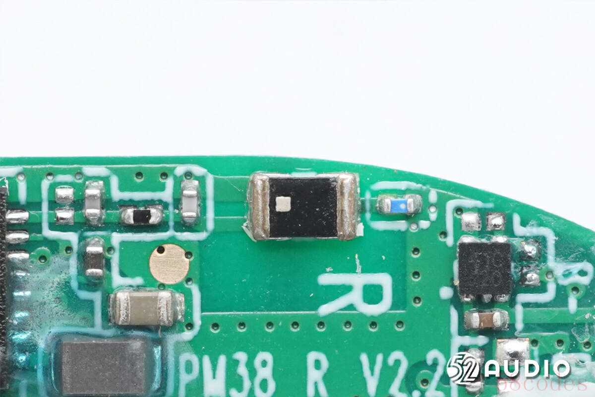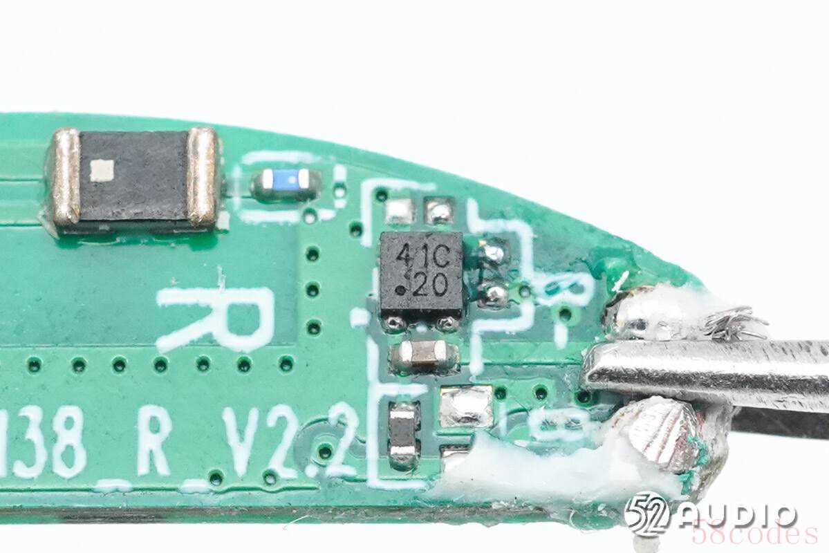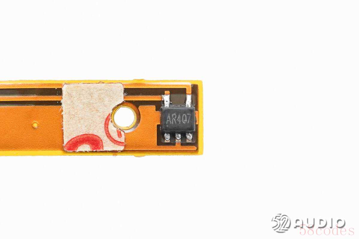 丝印AR407的霍尔元件,用于感知充电盒开启/关闭时的磁场变化,进而通知充电盒MCU和耳机与已连接设备配对或断开连接。
