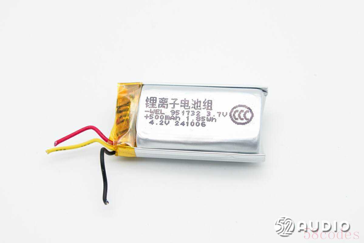 充电盒内置锂离子电池组,型号:WEL951732,标称电压:3.7V,额定容量:500mAh 1.85Wh,充电限制电压:4.2V,来自WEL旭航诚。