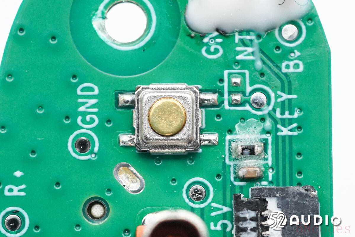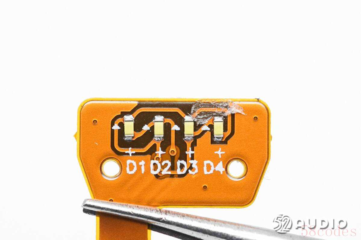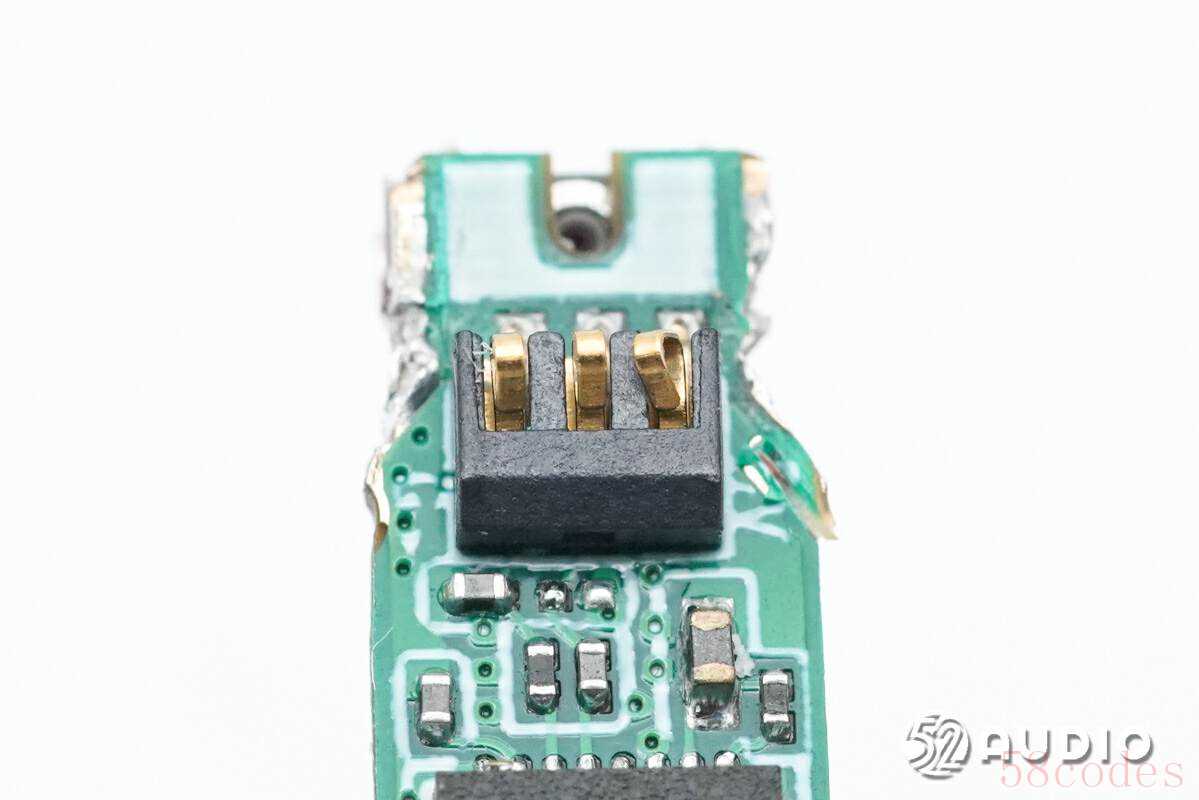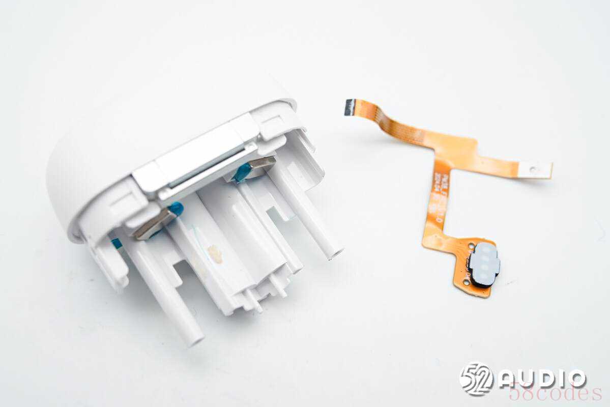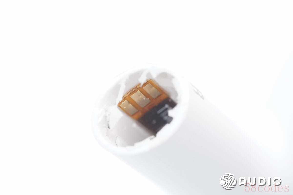 耳机柄内部的触摸控制传感器特写,通过触点连接主板。