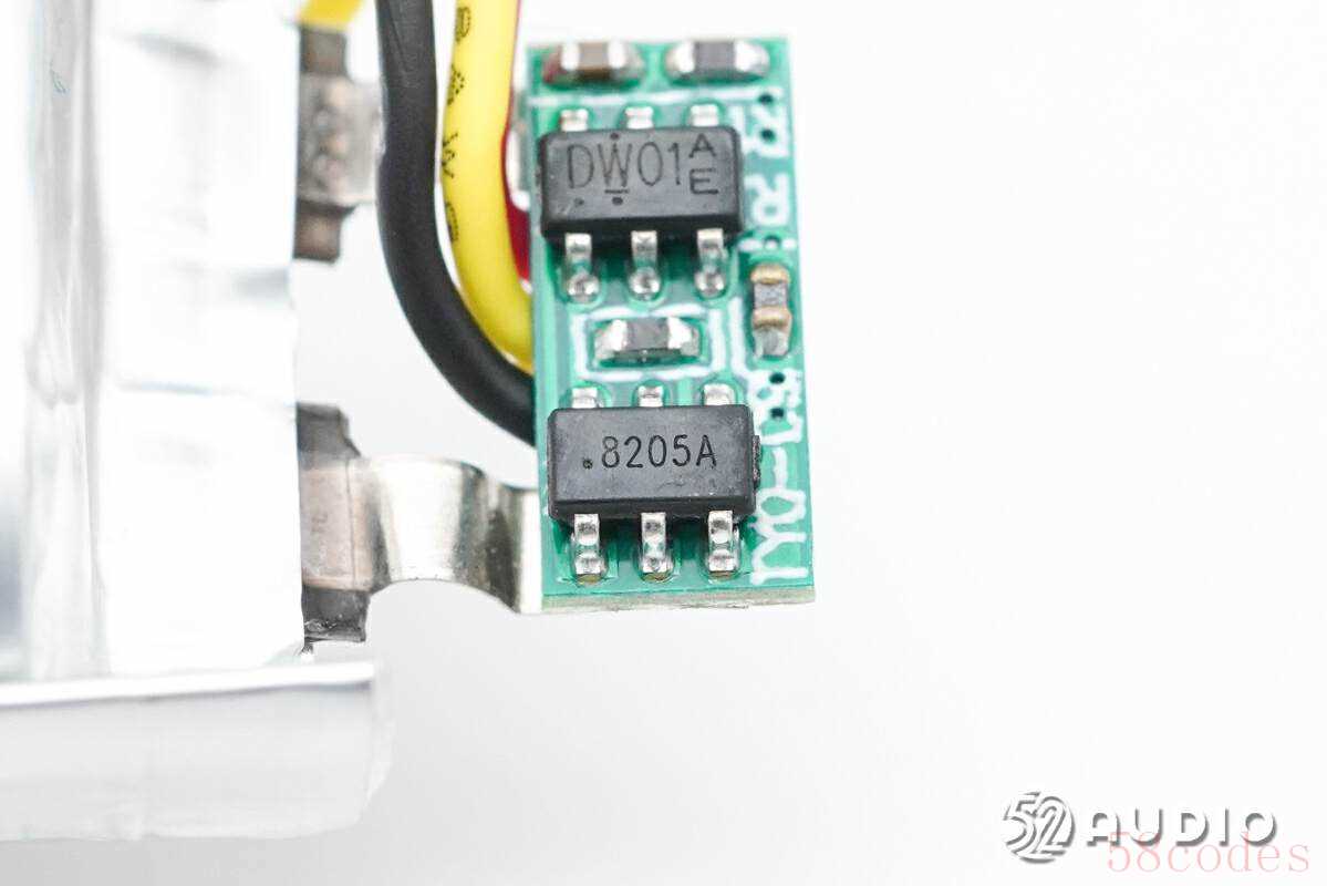 撕开绝缘保护,电池保护板一侧电路一览,设置有锂电保护IC和MOS管,以及用于检测电池温度的热敏电阻。