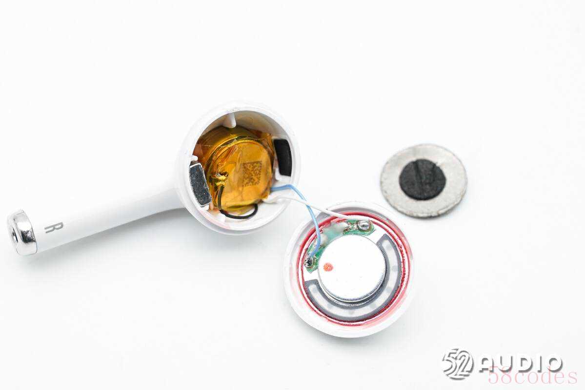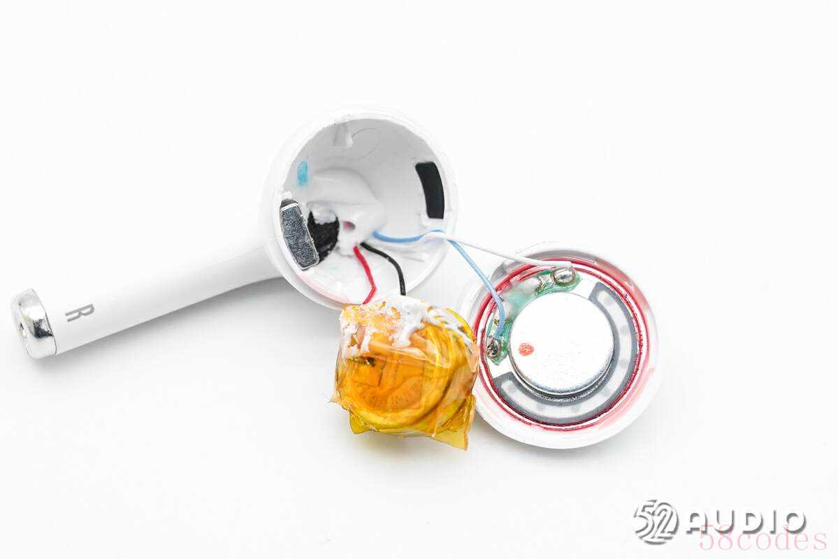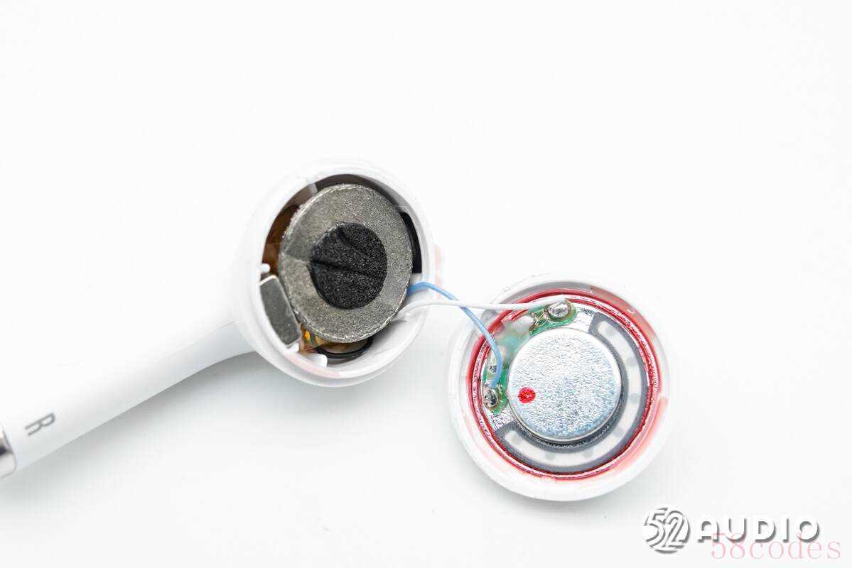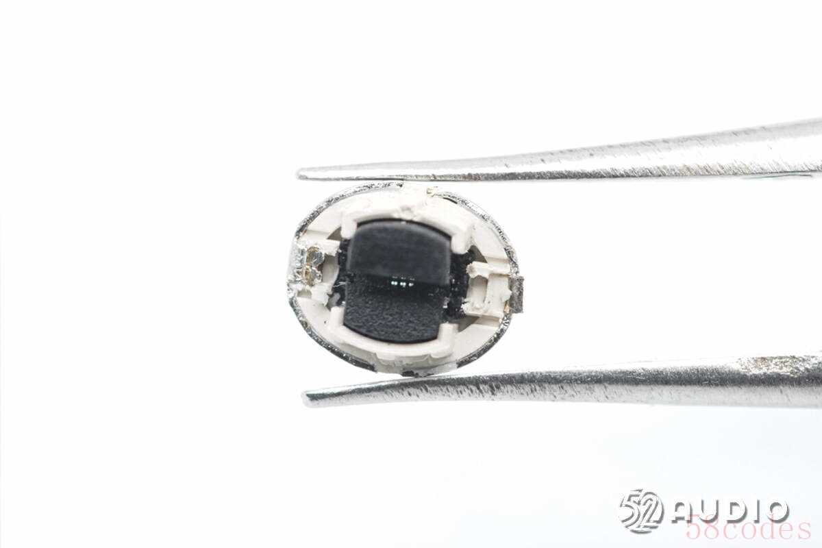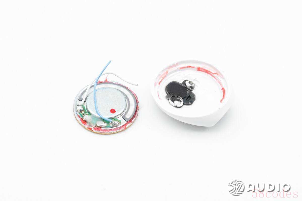 拆解耳机部分,沿合模线打开音腔,后腔内部设置有隔磁贴纸分隔腔体。