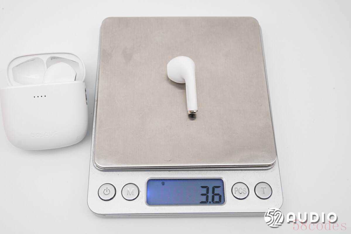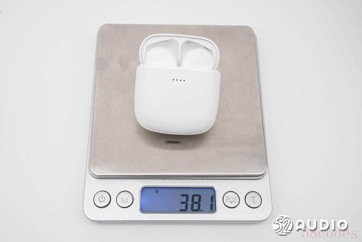 经我爱音频网实测,Baseus倍思Bowie W04真无线耳机整体重量约为38.1g,非常轻盈便携。