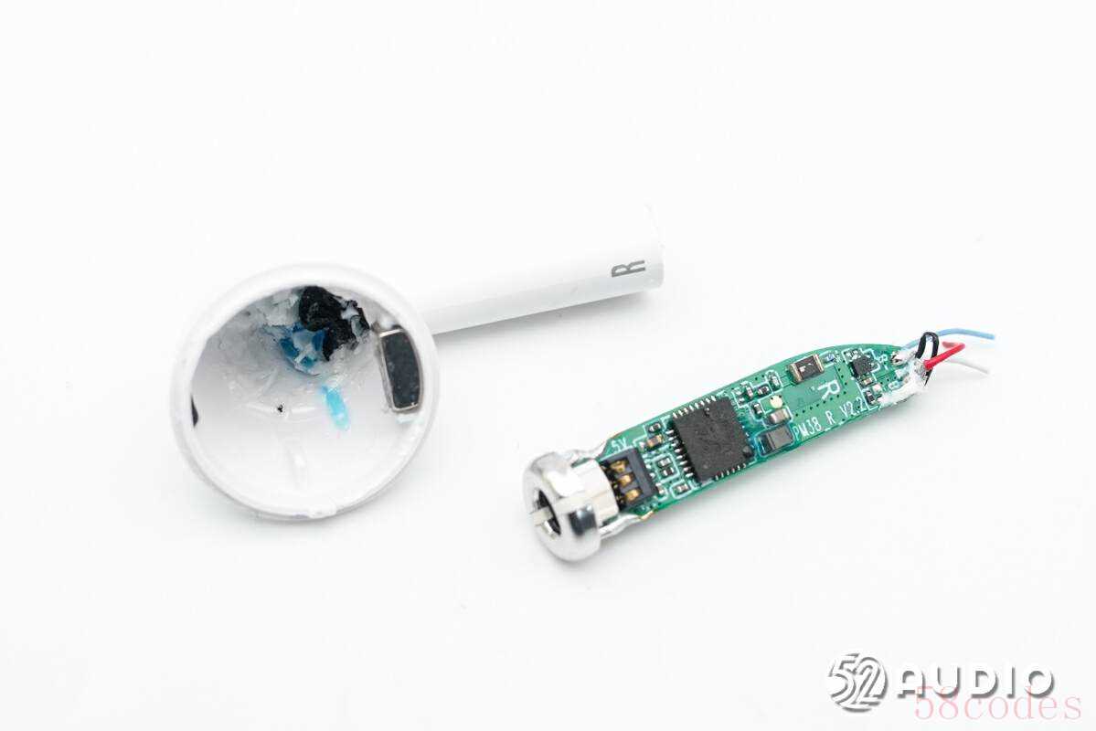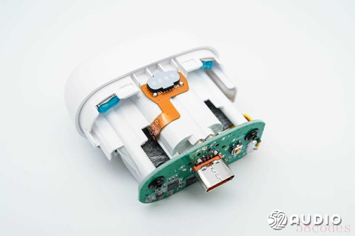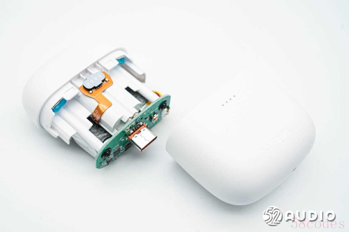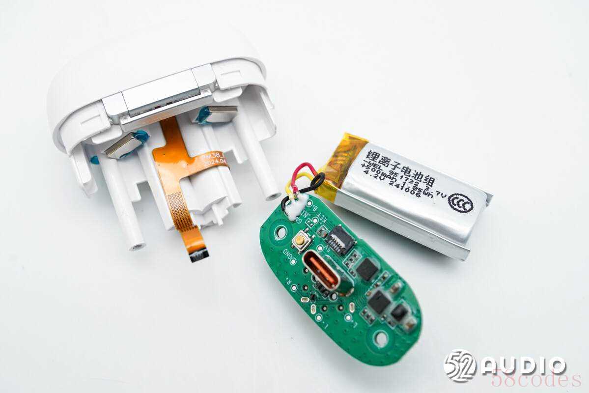 拆开充电盒外壳,取出卡扣式固定的座舱结构。