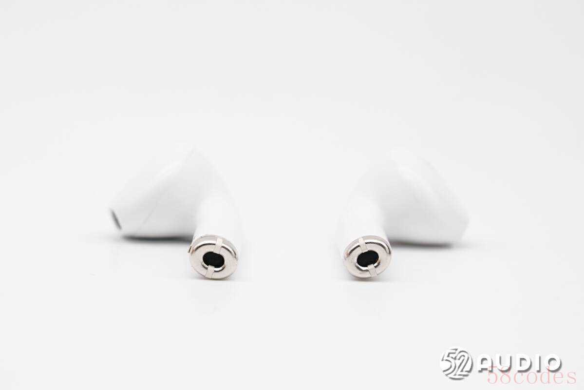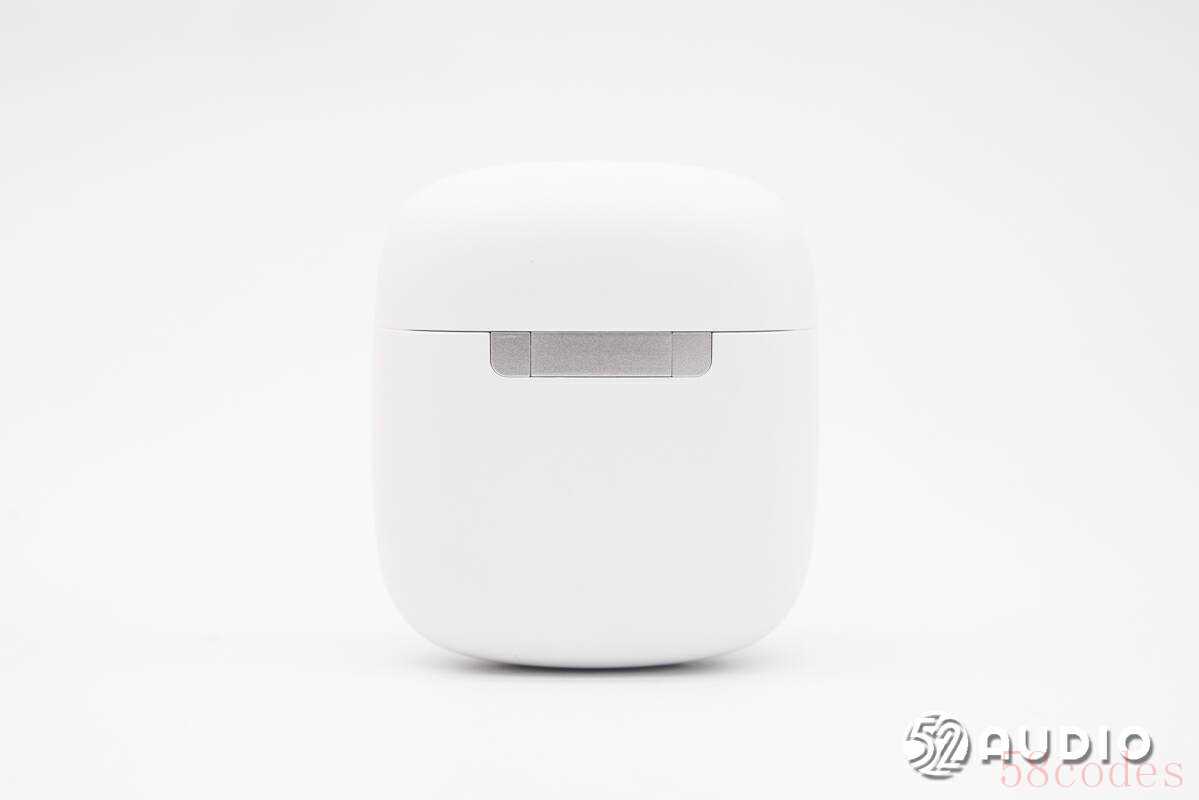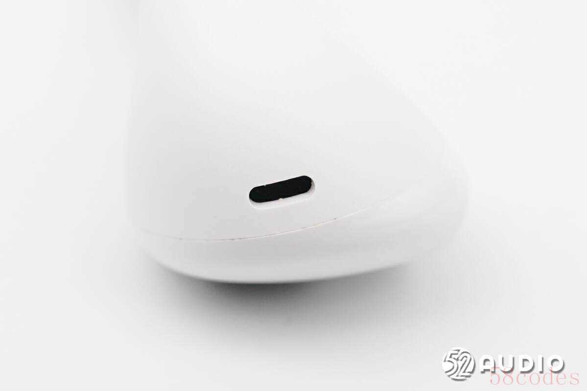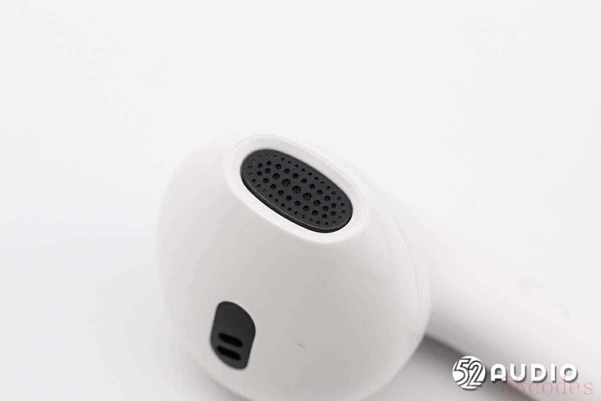 耳机柄底部设置充电尾塞,中间是麦克风拾音孔,通过丝网防护。
