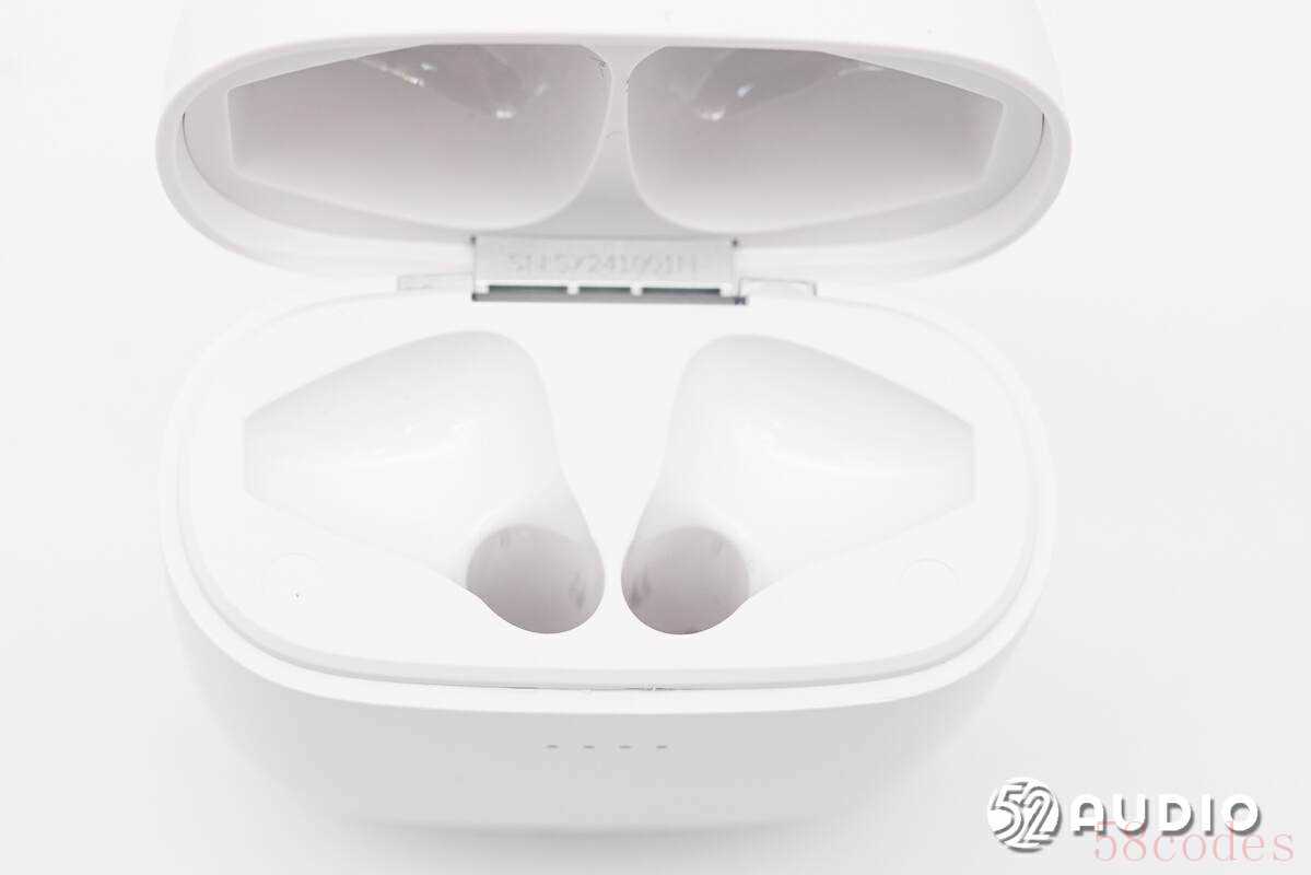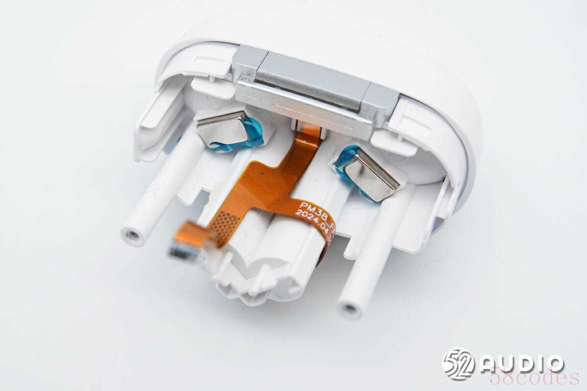 打开充电盒盖,取出耳机,座舱内部结构一览。