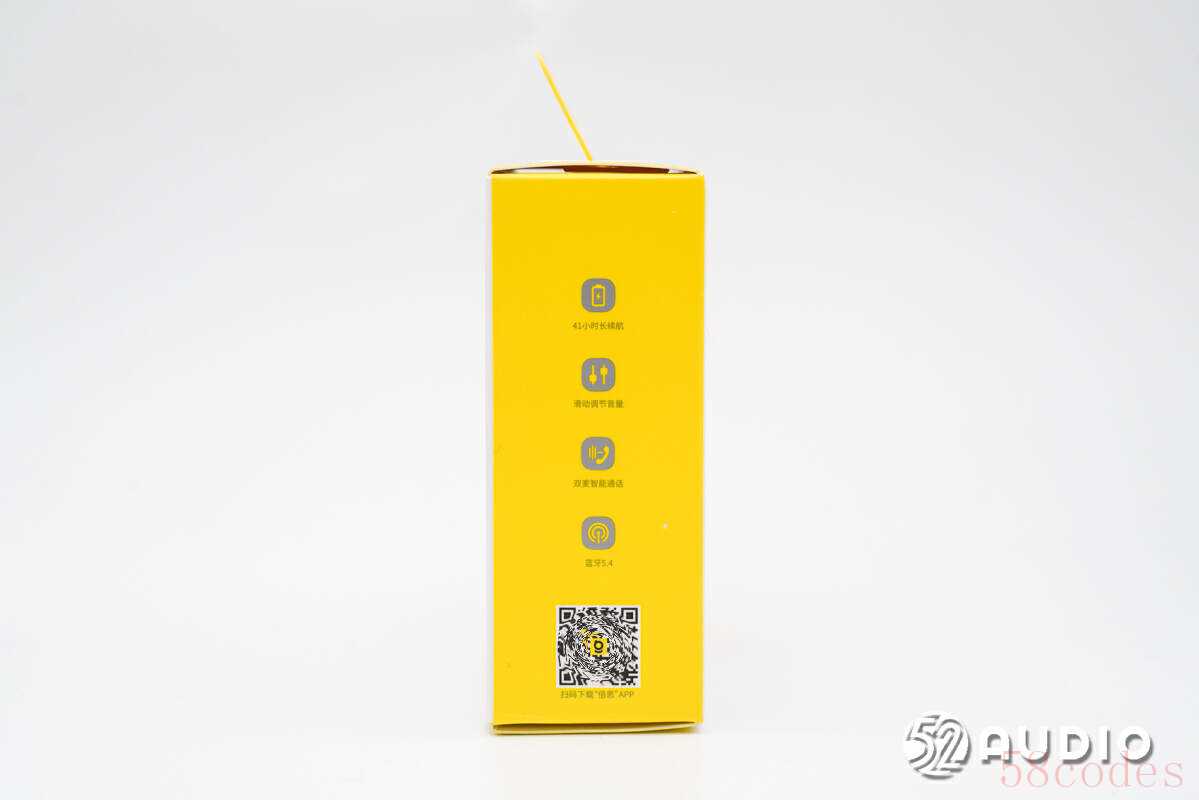 包装盒侧边介绍有产品的功能特点:41小时长续航、滑动调节音量、双麦智能通话、蓝牙5.4,以及倍思App下载二维码。