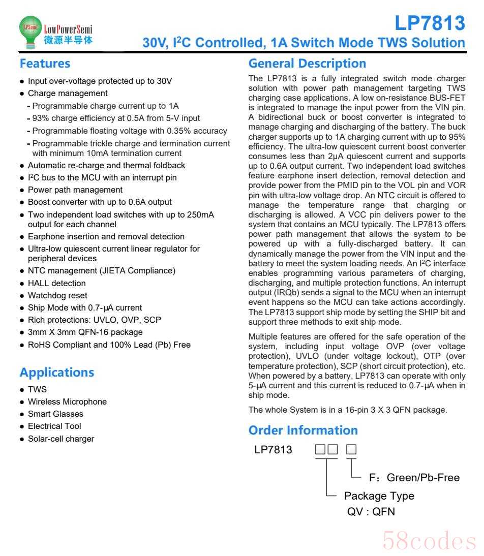 LPS微源半导体LP7813智能TWS充电仓管理IC,支持输入30V高耐压,过压保护5.85V,可编程充电电流高达1A,升压转换器输出电流高达0.6A,两路独立串口,支持左右耳独立双向通讯,内置看门狗功能,NTC管理,HALL检测,集成丰富的保护模块;支持船运模式,船运模式下功耗低至0.7μA,满足超长时间海运需求。充电电流及充满电压IIC可灵活配置。LP7813作为微源HERO Charge系列家庭的一员,同样支持耳机电压跟随充电,有效提升充电效率15%左右,从而延长整机续航时间。