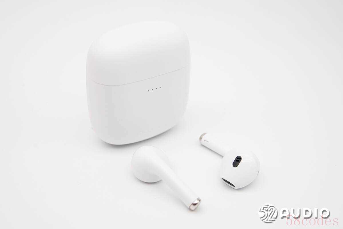 "整体造型:" Bowie W04 采用了目前主流的真无线耳机造型,由两个独立的充电仓和两只耳机本体组成。充电仓设计相对紧凑,边缘圆润,握持感舒适。耳机本体设计简洁,形态饱满。