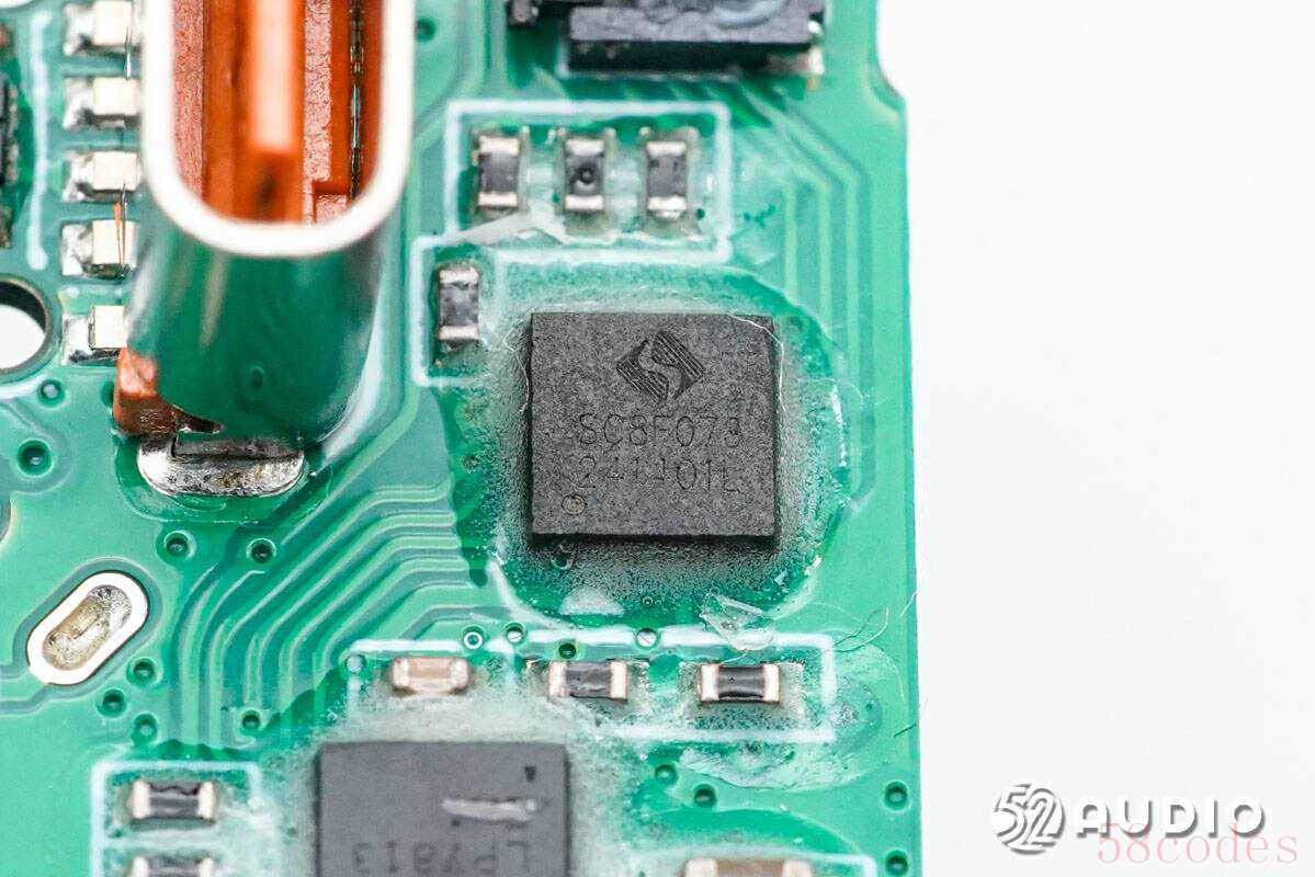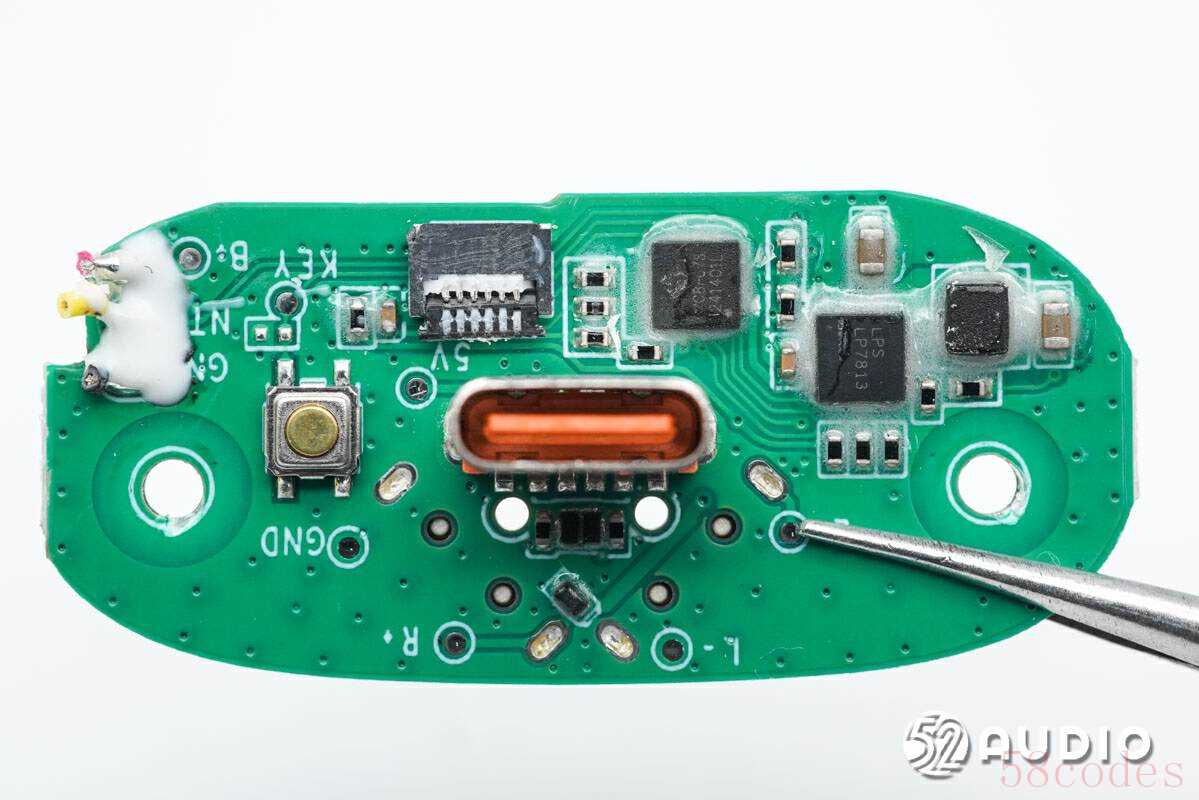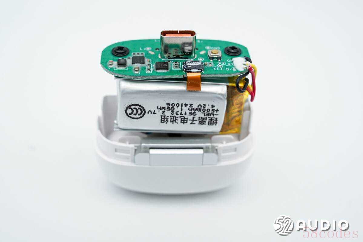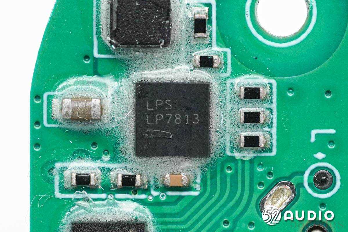 内部主要配置方面,充电盒搭载了WEL旭航诚500mAh锂电池组,采用了LPS微源半导体LP7813智能TWS充电仓管理IC负责充放电管理,支持30V高耐压,支持耳机电压跟随充电,有效提升充电效率15%左右,从而延长整机续航时间;还采用了Cmsemicon中微半导体SC8F073系列单片机,负责整机控制。
