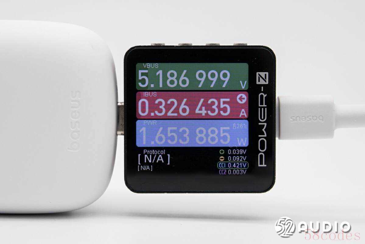 我爱音频网采用CHARGERLAB POWER-Z KM003C测试仪对Baseus倍思Bowie W04真无线耳机进行充电测试,输入功率约为1.65W。