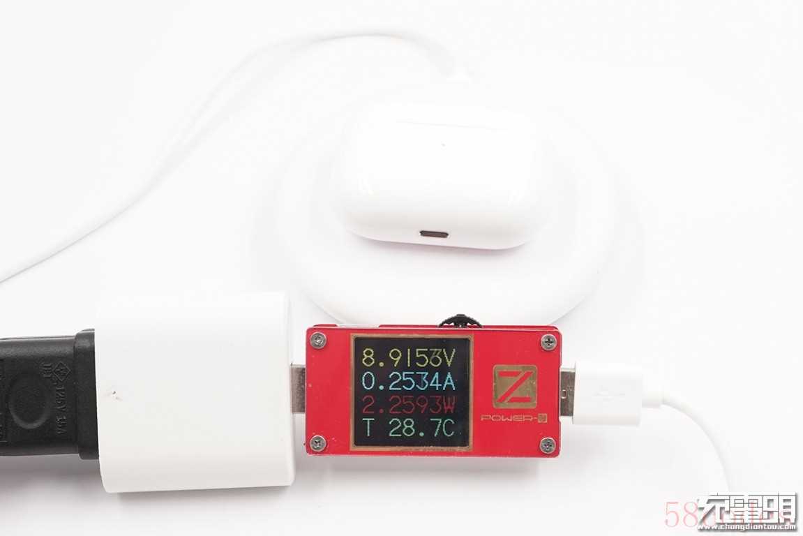 使用华为27W无线充电器给AirPods Pro充电,当前无线充输入端电压为8.9V,电流0.33A,功率2.93W,可以正常充电。