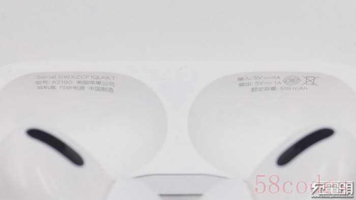 充电仓上盖内部文字信息:型号:A2190,美国苹果公司,耳机盒行动电源,中国制造;输入:5V⎓1A,输出:5V⎓1A,额定容量:519mAh(PS:前两代的AirPods耳机盒行动电源输入:5.2V⎓2.4A,输出:5V⎓1A)。