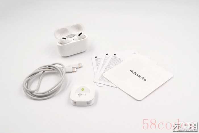 打开包装,内有AirPods Pro耳机、耳机充电仓、USB-C to Lightning数据线,以及说明书、保修卡等纸质文件。