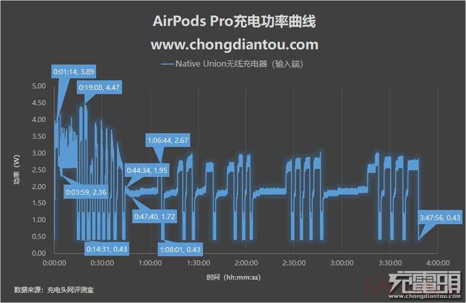 然后是使用Native Union无线充电器充AirPods Pro时的功率变化情况(无线充电器输入端)。从图表中可以看出,本次充电功率整体波动变化较大,同时也出现了多个不同的比较明显的功率波动范围。充电刚开始的波动范围为2.36~3.89W;第二个较为明显的波动范围为0.43~4.47W;第三个较为明显的波动范围为1.72~1.95W;第四个较为明显的波动范围为0.43~2.67W。在充电一小时八分钟后,充电功率一直按照第三、第四波动情况重复进行。全程耗时3小时47分钟,全程最大功率为4.47W。