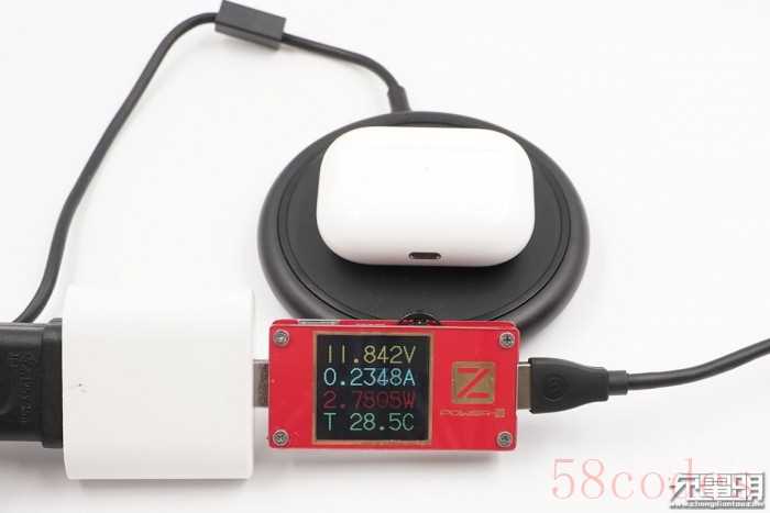 使用mophie 10W无线充电器给AirPods Pro充电,当前无线充输入端电压为11.84V,电流0.23A,功率2.78W,可以正常充电。