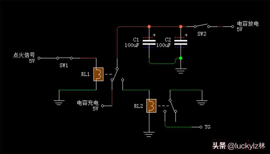 熄火瞬间,电容有电,RL2动作,触发TG低电平。电容放电约1秒后没电,RL2断开:
