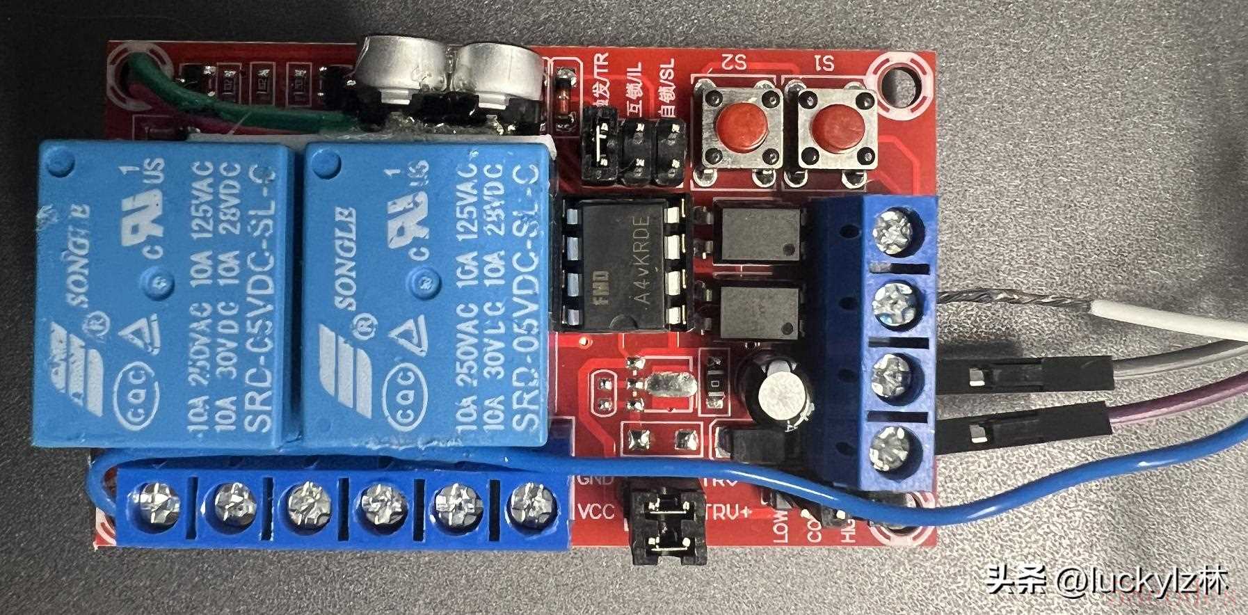 跳线设置成高电平触发。车辆解锁时,没有任何动作;点火后,第1个继电器工作,给2个电容共200uf充电;熄火后,电容放电触发第2个继电器,大约持续1秒钟,用来触发低电平信号。控制蓝牙模块,断开钥匙的电。
