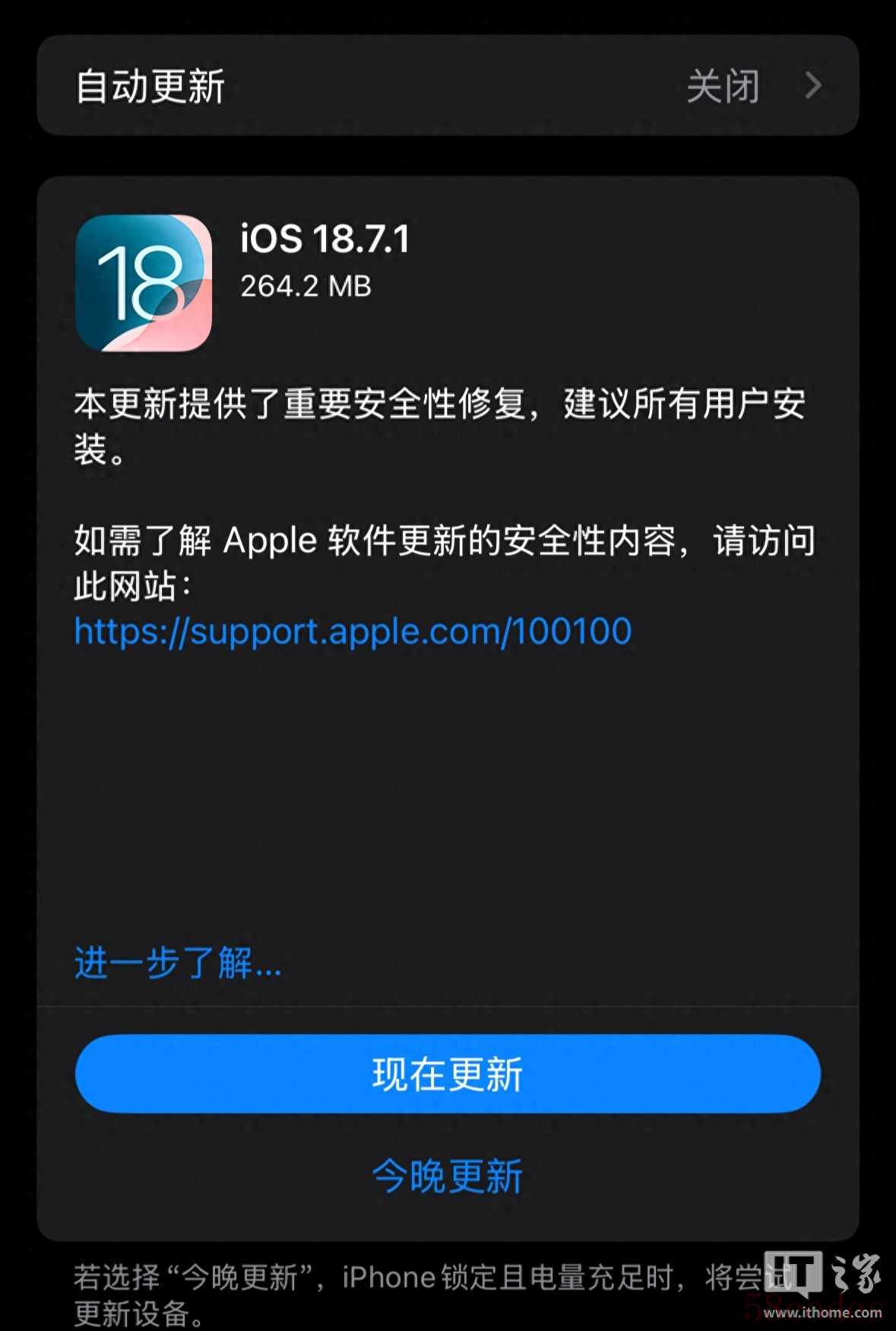 IT之家 9 月 30 日消息,苹果今日向未升级 iOS / iPadOS 26 的用户推送了 iOS / iPadOS 18.7.1 正式版更新,主要提供安全修复。