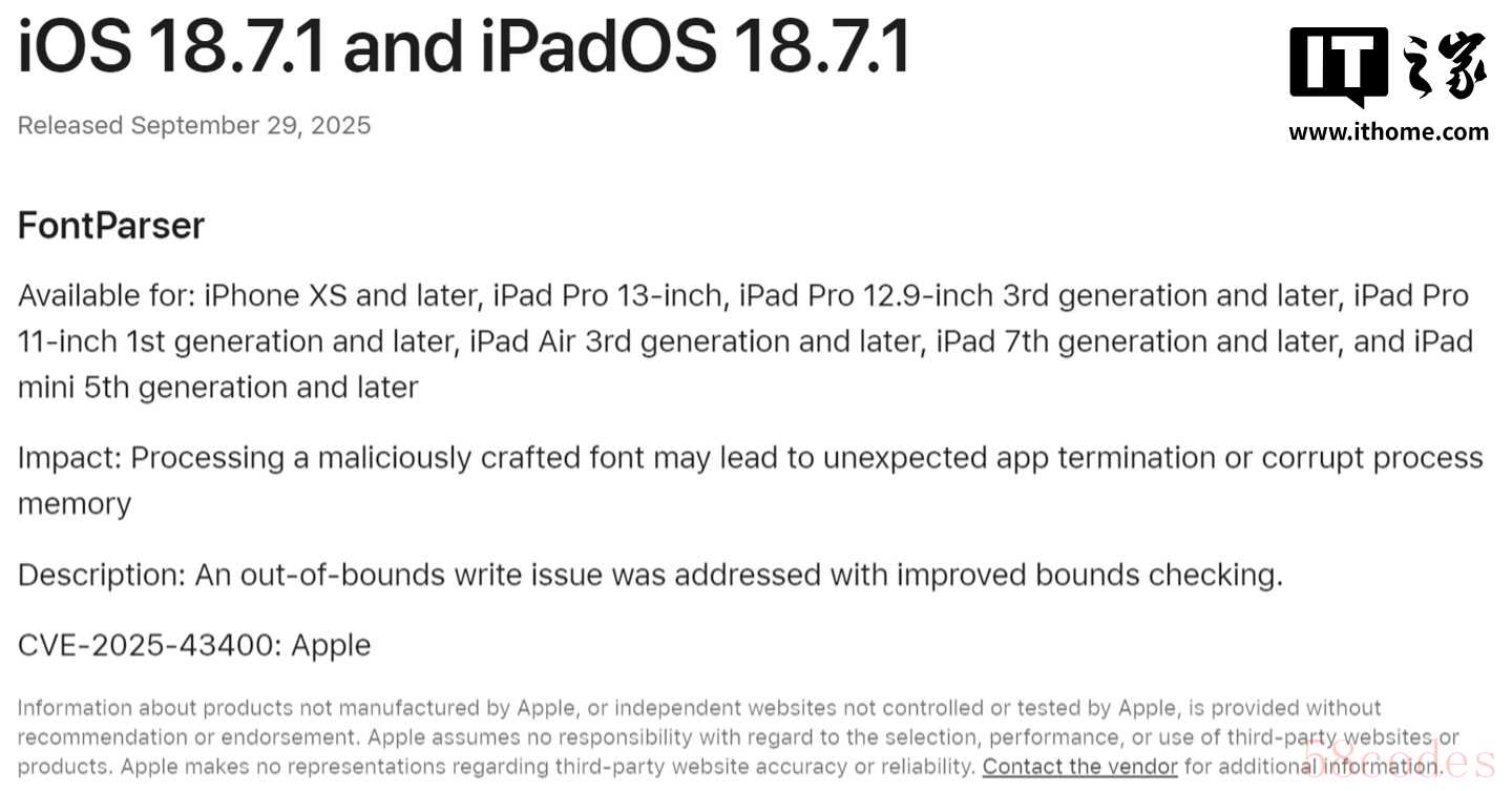 IT之家查询苹果官网支持页面获悉,iOS / iPadOS 18.7.1 主要修复了 FontParser 组件中的一个漏洞:处理恶意制作的字体文件可能导致应用意外终止或进程内存损坏。苹果通过改进边界检查,解决了这一越界写入问题。