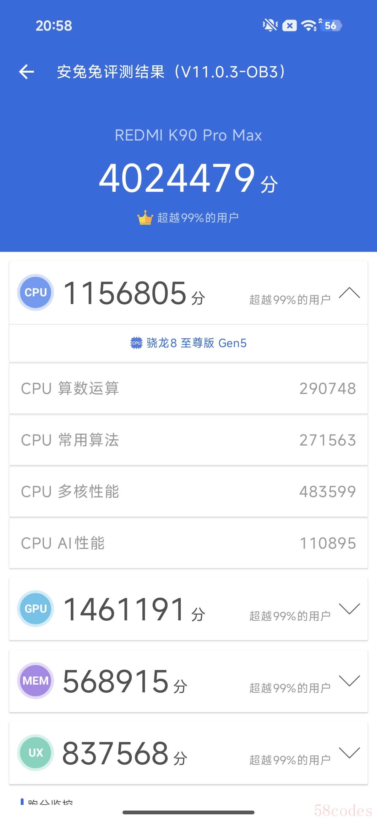 从理论性能测试来看,REDMI K90 Pro Max 安兔兔跑分测试的实际得分为 402 万分,是当之无愧的 Android 性能旗舰的第一梯队。