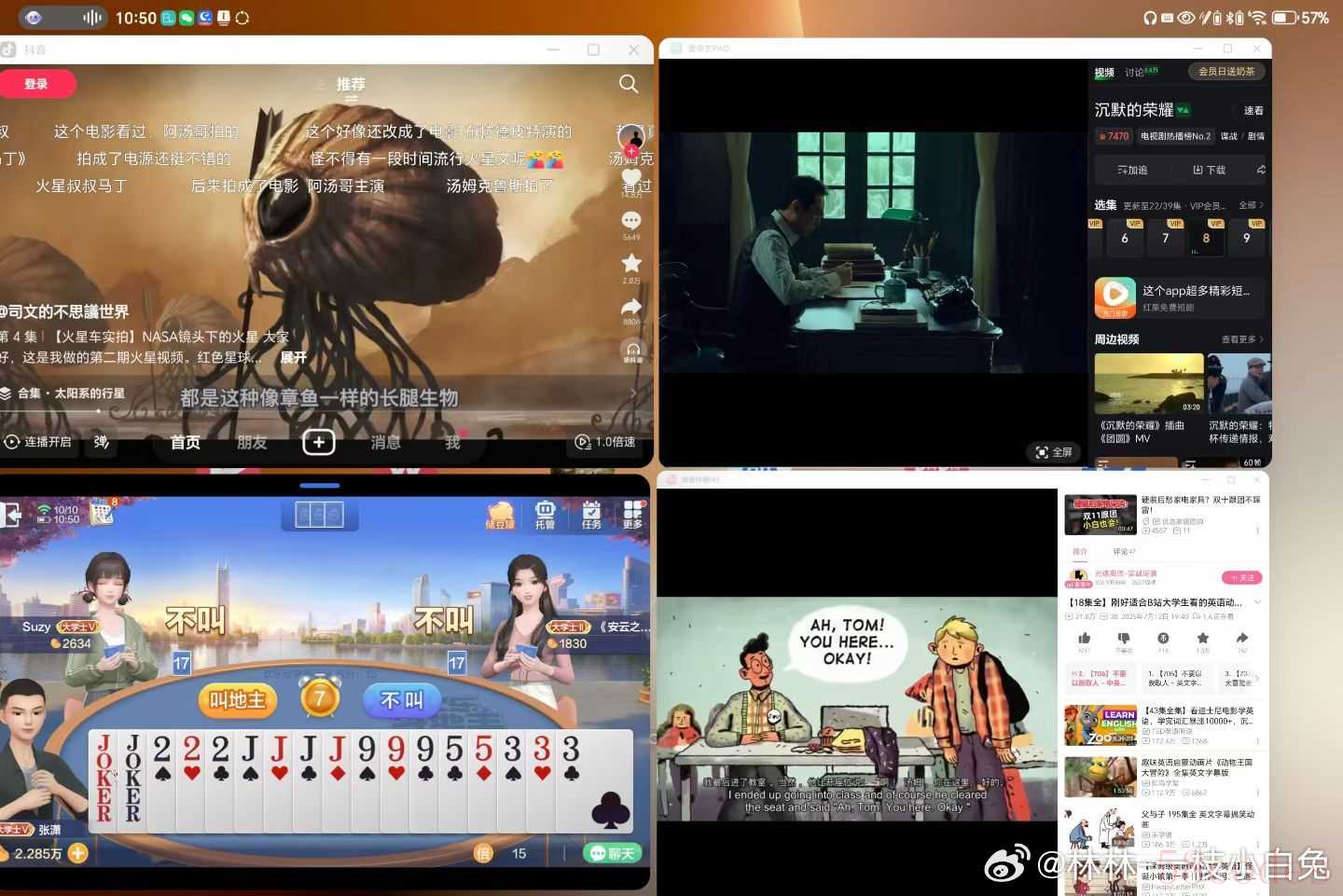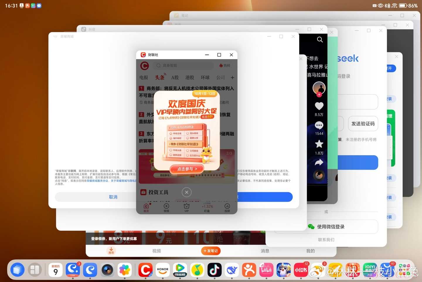 IT之家 10 月 14 日消息,荣耀全场景总裁林林今日分享了荣耀 MagicPad3 Pro + MagicOS 10 for Pad“平板 PC”的更多细节。从图片来看,荣耀 MagicPad3 Pro 可支持约 10 款应用同屏运行,同时支持在运行游戏时,播放电视剧、短视频等。