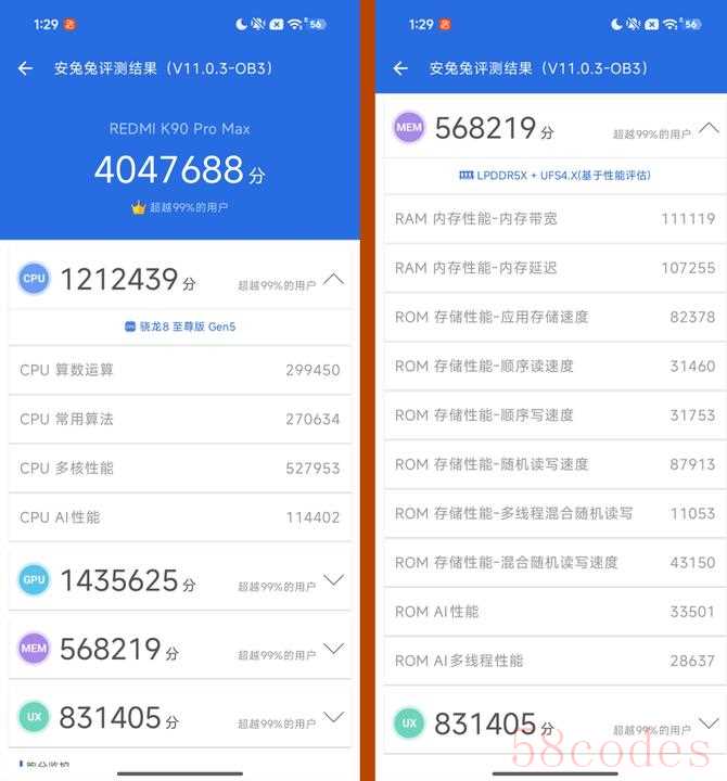 REDMI K90 Pro Max配置毫无疑问是是目前移动端最强平台,高通第五代骁龙8至尊版移动平台,配合上LPDDR5X+UFS 4.1的黄金组合,安兔兔跑分来到了404W,性能表现非常出色。
