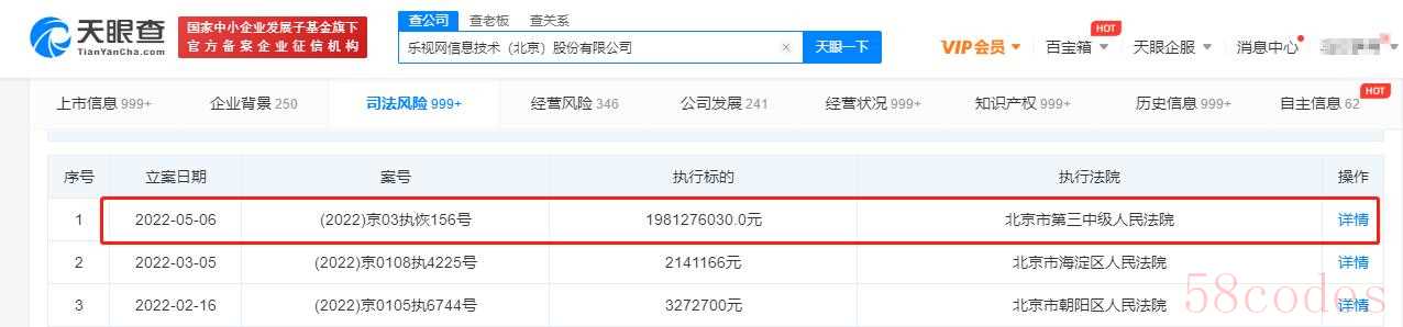 中国质量新闻网讯(闫冬)5月6日,乐视网信息技术(北京)股份有限公司(以下简称:乐视网)新增一则被执行人信息,执行标的19.8亿余元,涉及该公司与融创房地产集团有限公司的仲裁案件,执行法院为北京市第三中级人民法院。