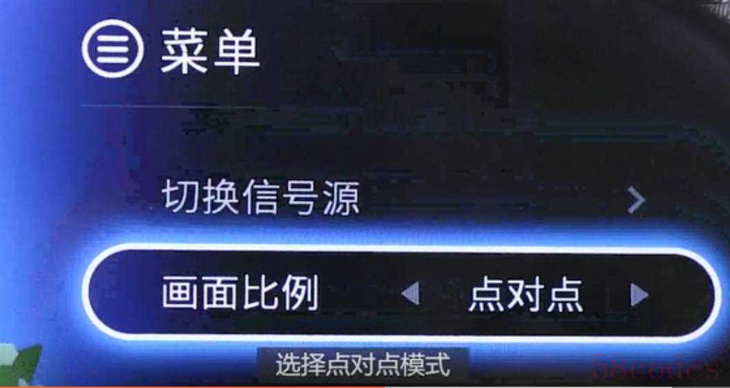 第二个解决方法,用遥控器来设置,按下遥控器的菜单,选择画面比例,注意:我们这里演示的是乐视电视,有些电视的遥控器上可能是宽高比,虽然我们演示的操作方法适用于大多数电视,但还是请以您手中的遥控器为准进行操作,选择点对点模式,这时候我们就会看到电视回到全屏状态。