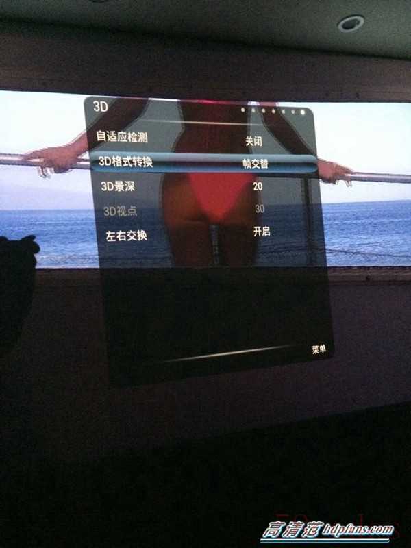 升级固件后点3D只有左右和上下两种是看不到效果的,需要在遥控器点菜单按钮,选择最后一页,选择3D格式转换,选择行交织或者棋盘格。你看到3D效果出来了,出屏效果很好,质感很好,很是享受。