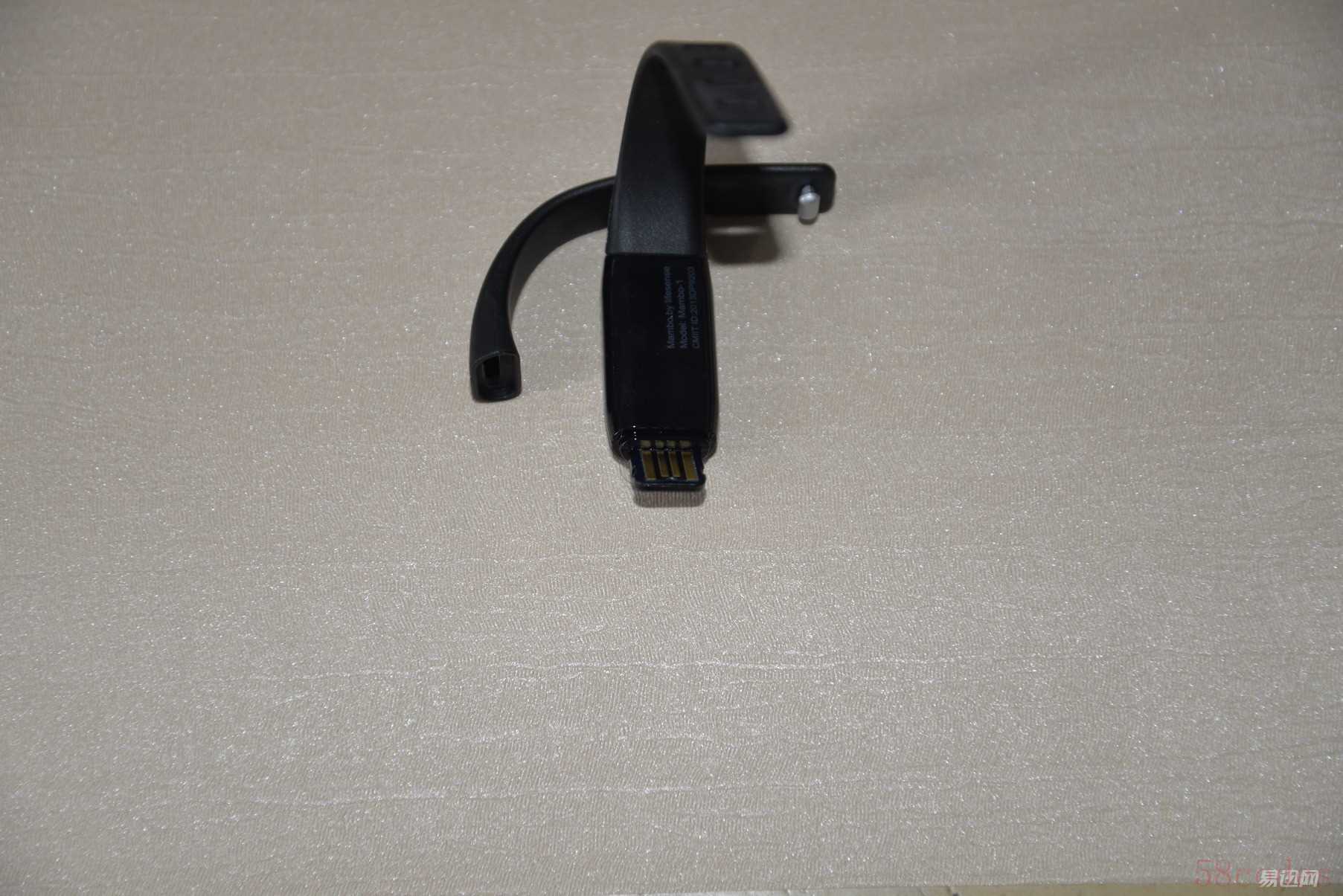 充电口在表带里,有USB标志的那一边,非常紧凑,拔出来和插进去都要很用力,虽然略有些不方便,但是总比松松垮垮用着用着掉出来要好得多。充电口采用的标准USB,可以直接插在电源适配器,电脑,移动电源上。我就是通过移动电源来激活的。