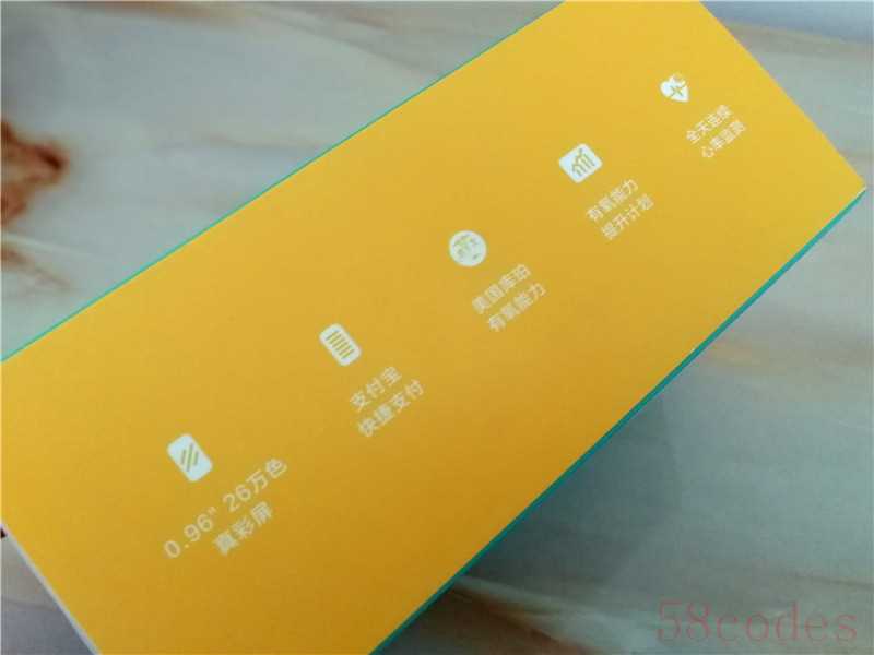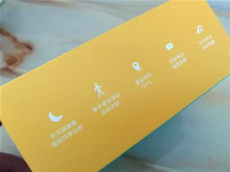 两侧印着手环的全天候睡眠智能科学分析、跑步健走游泳自动识别、智能联机GPS、消息电话智能提醒、30米防水游泳佩戴等丰富的功能和配置情况。